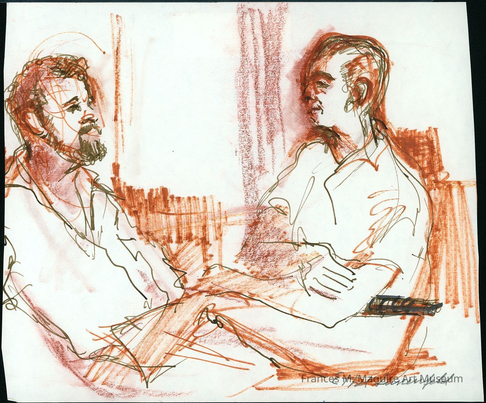 20th-c. marker, crayon, and ink drawing of two men sitting and facing each other.Artwork Details