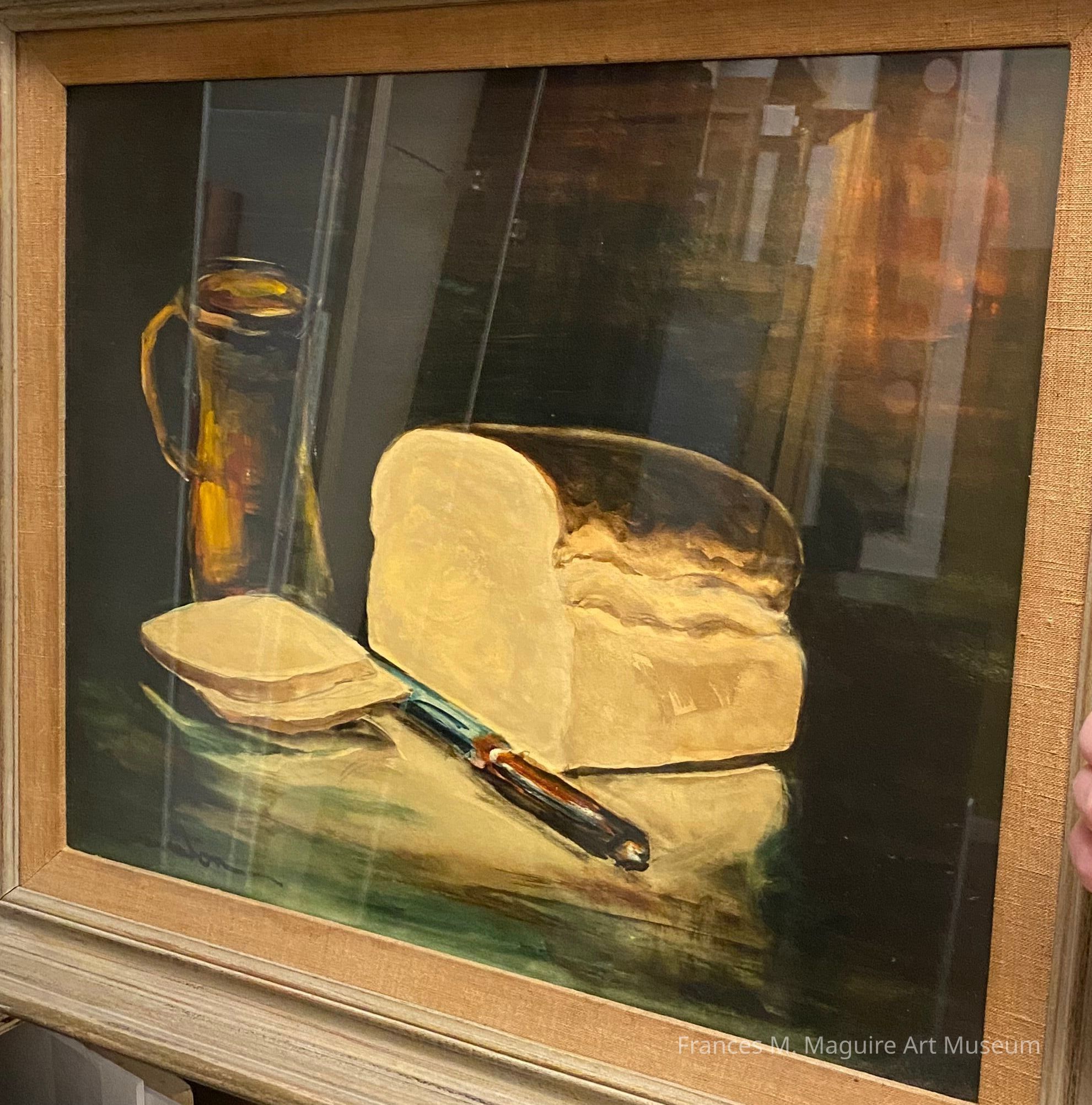 20th-c. oil painting of a still life scene of bread, a knife, and a jug.Made/Created
