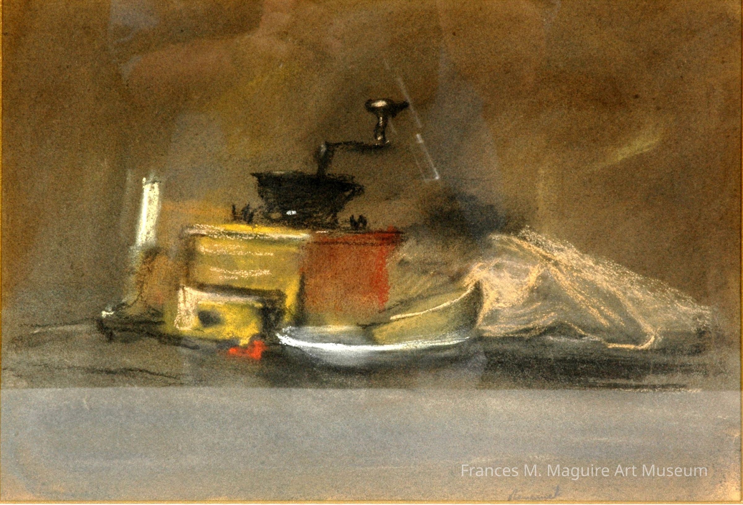 20th-c. pastel drawing of a still life table scene with a black grinder, candle, and food.Made/Created