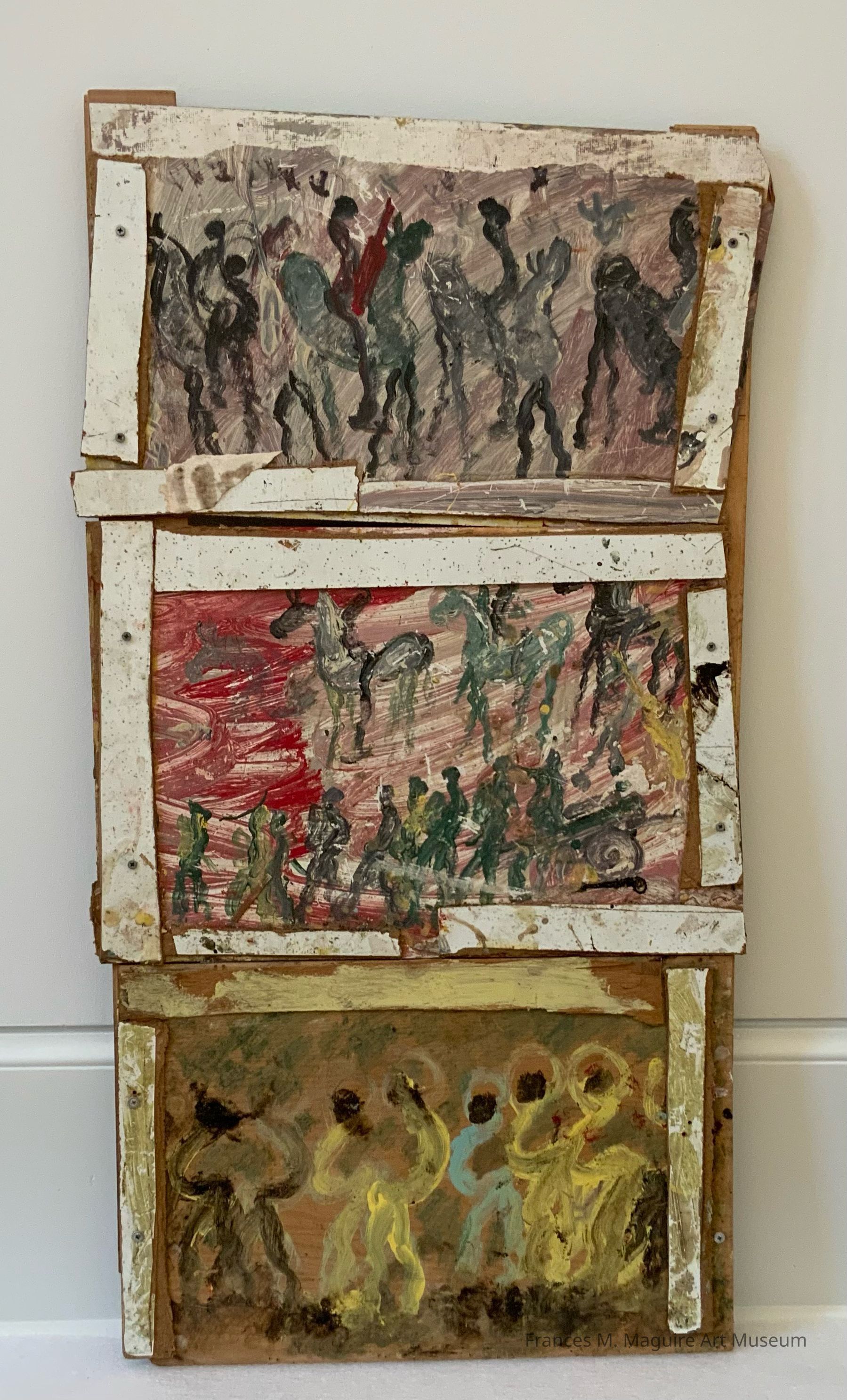 Self-taught artist Purvis Young draws attention to the challenges faced by underrepresented urban communities, including racism, violence, and drug abuse. Central to his work is Overtown, a historic black neighborhood in Miami, Florida, where Young lived most of his life. Once a thriving community, in the 20th c. Overtown became increasingly isolated and neglected in the wake of Miami’s urban renewal campaigns. Young made his works using scraps of paper, wood, fabric, and various industrial items he found at construction and trash sites in Overtown. His distinctive style combines these raw materials with expressive brushwork and a visual vocabulary that often features protesters, pregnant women, horses, enslaved figures, warriors, and large, looming eyes. Claiming “I paint what I see,” Young’s artworks manifest his personal experiences in Overtown. They also stress the significance of themes such as death, adversity, and hope to all humanity.