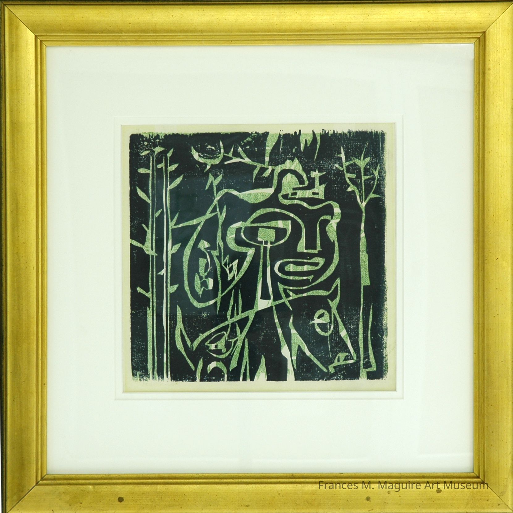 20th-c. color woodcut depicting an abstracted face over an animal.Made/Created