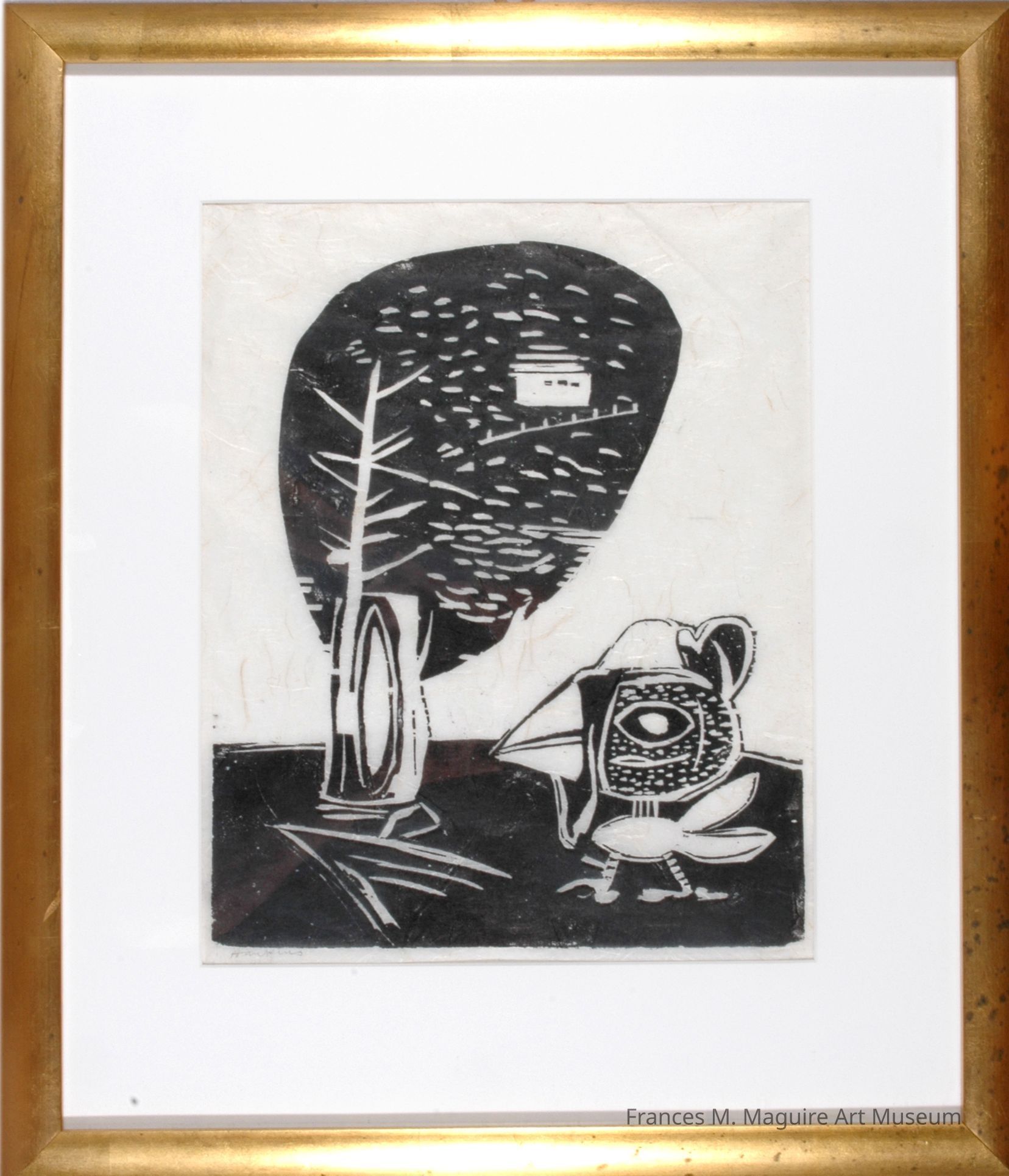 20th-c. black-and-white woodcut of a tree and a bird.Made/Created