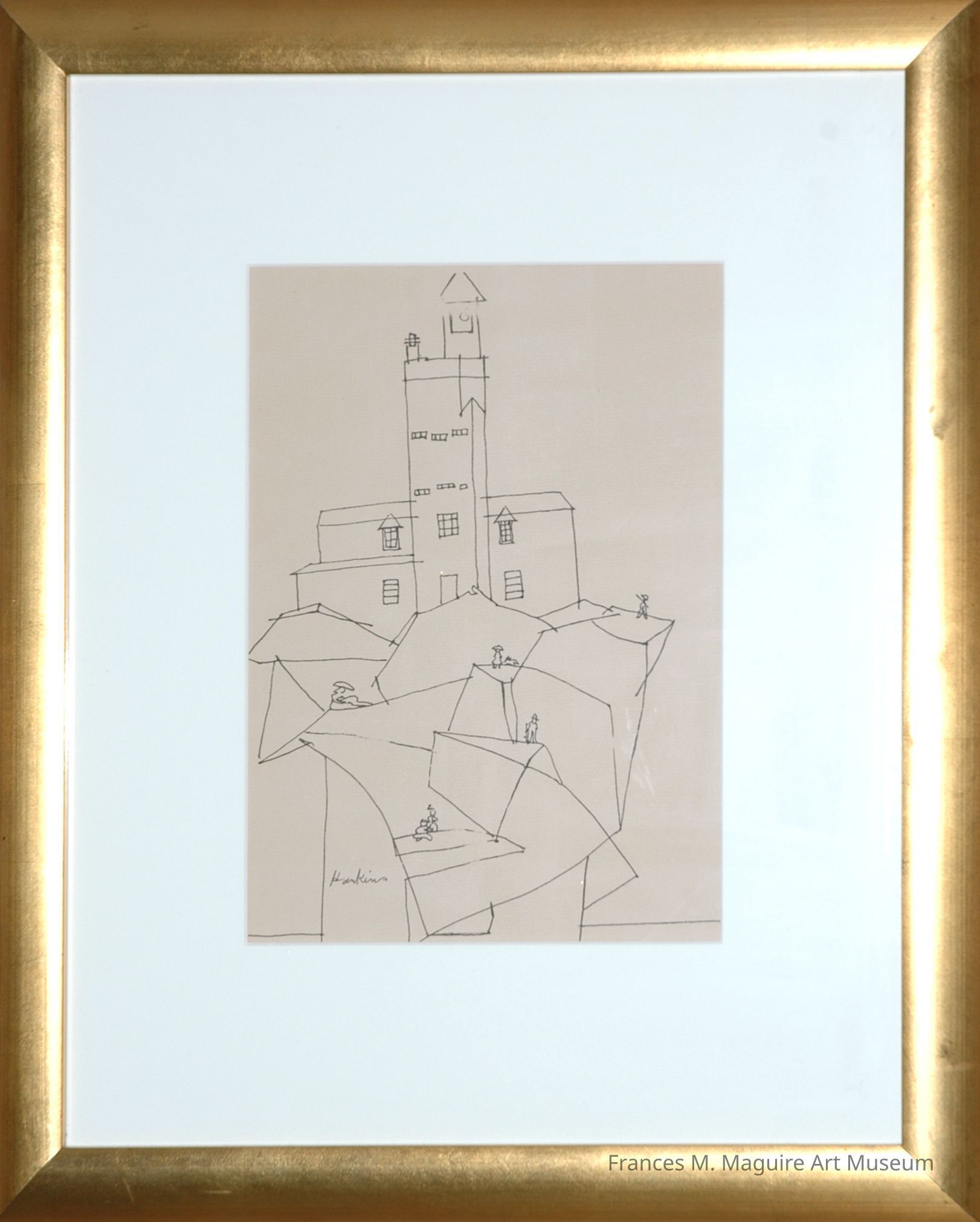 20th-c. pen drawing of people climbing rocks to a church with a tower.Made/Created