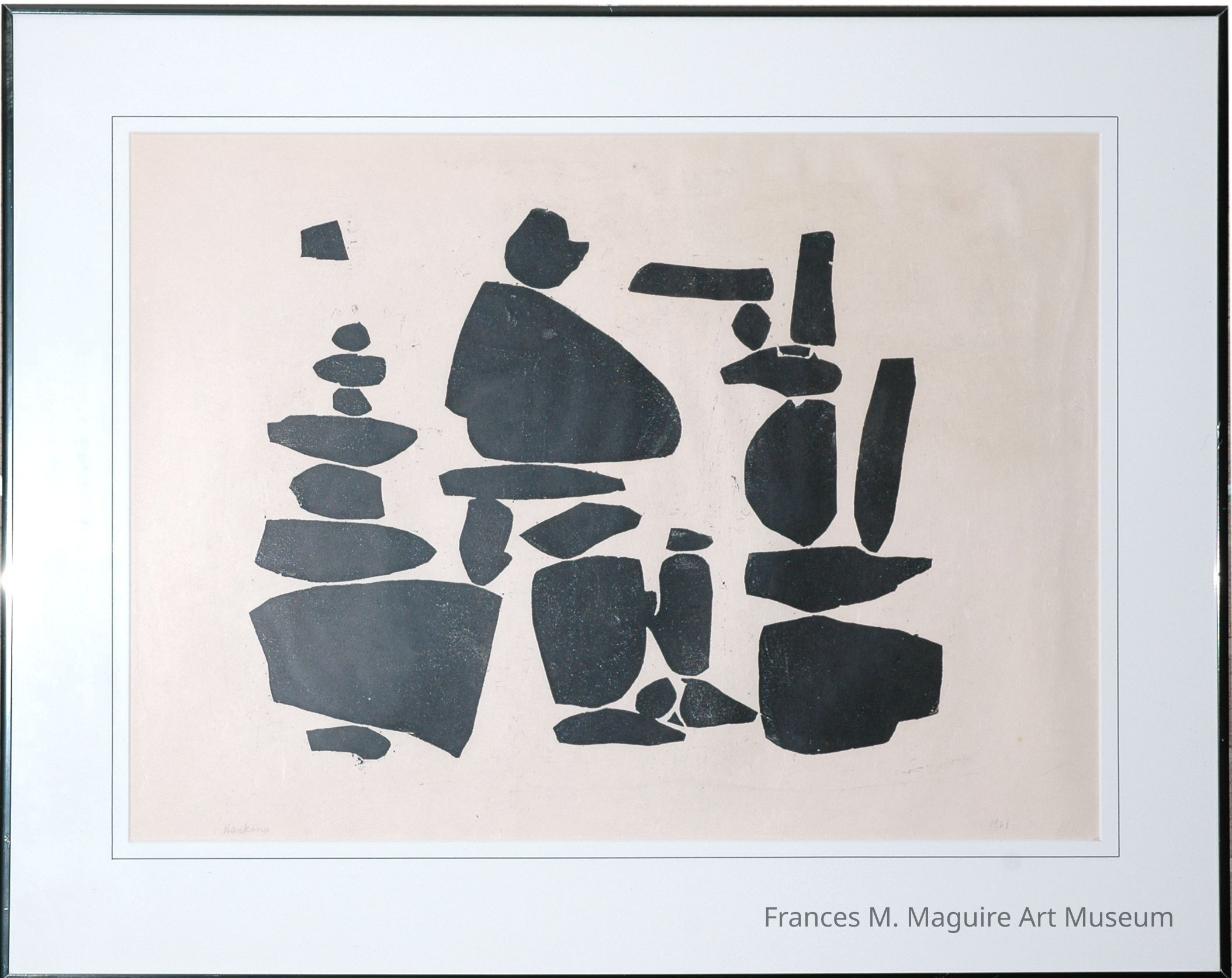20th-c. black-and-white woodcut print of stacked rock-like shapes.Made/Created