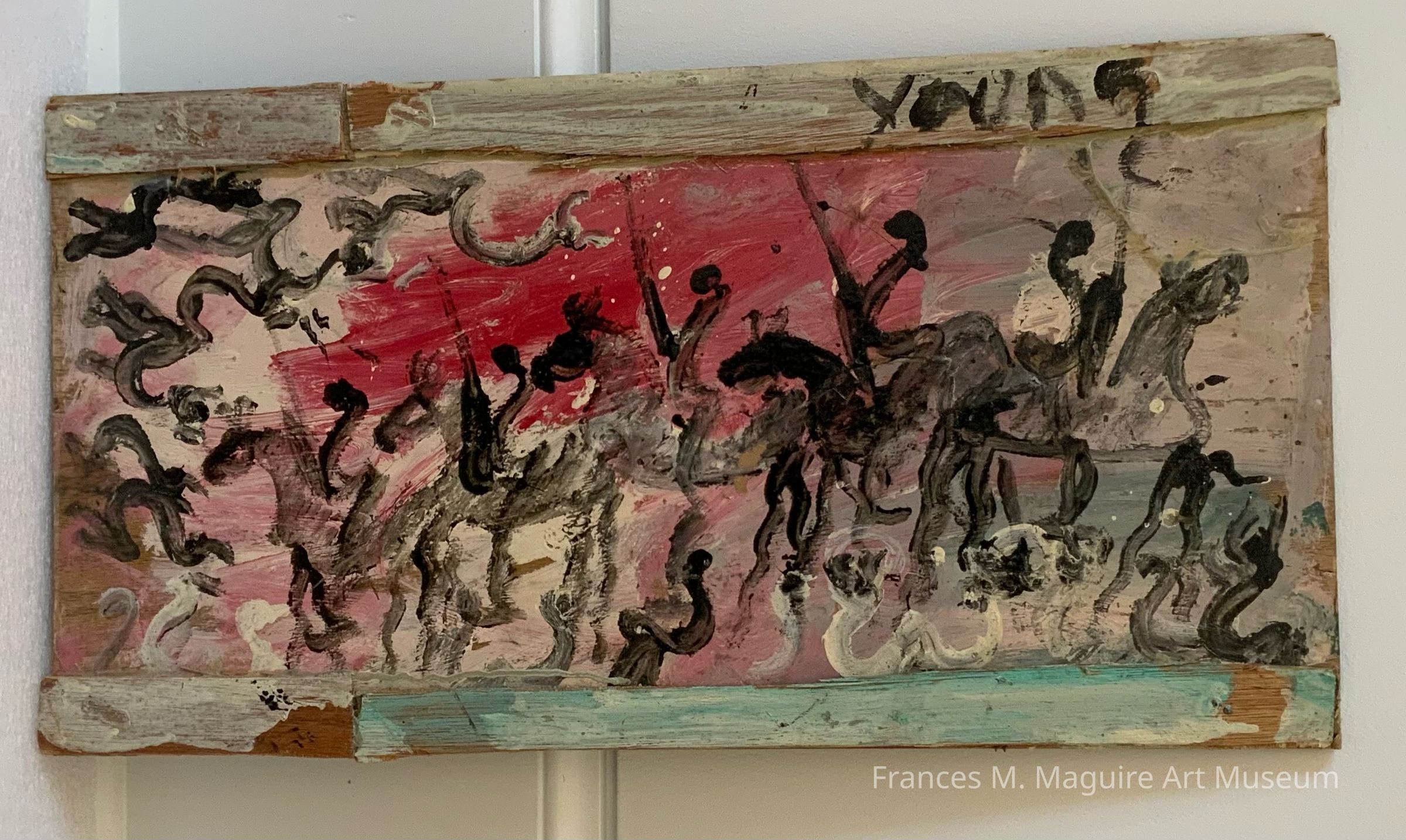 “My feeling was the world might be better if I put up my protests.” Self-taught artist Purvis Young draws attention to the challenges faced by underrepresented urban communities, including racism, violence, and drug abuse. Central to his work is Overtown, a historic black neighborhood in Miami, Florida, where Young lived most of his life. Once a thriving community, in the 20th c. Overtown became increasingly isolated and neglected in the wake of Miami’s urban renewal campaigns. Young made his works using scraps of paper, wood, fabric, and various industrial items he found at construction and trash sites in Overtown. His distinctive style combines these raw materials with expressive brushwork and a visual vocabulary that often features protesters, pregnant women, horses, enslaved figures, warriors, and large, looming eyes. Claiming “I paint what I see,” Young’s artworks manifest his personal experiences in Overtown. They also stress the significance of themes such as death, adversity, and hope to all humanity.