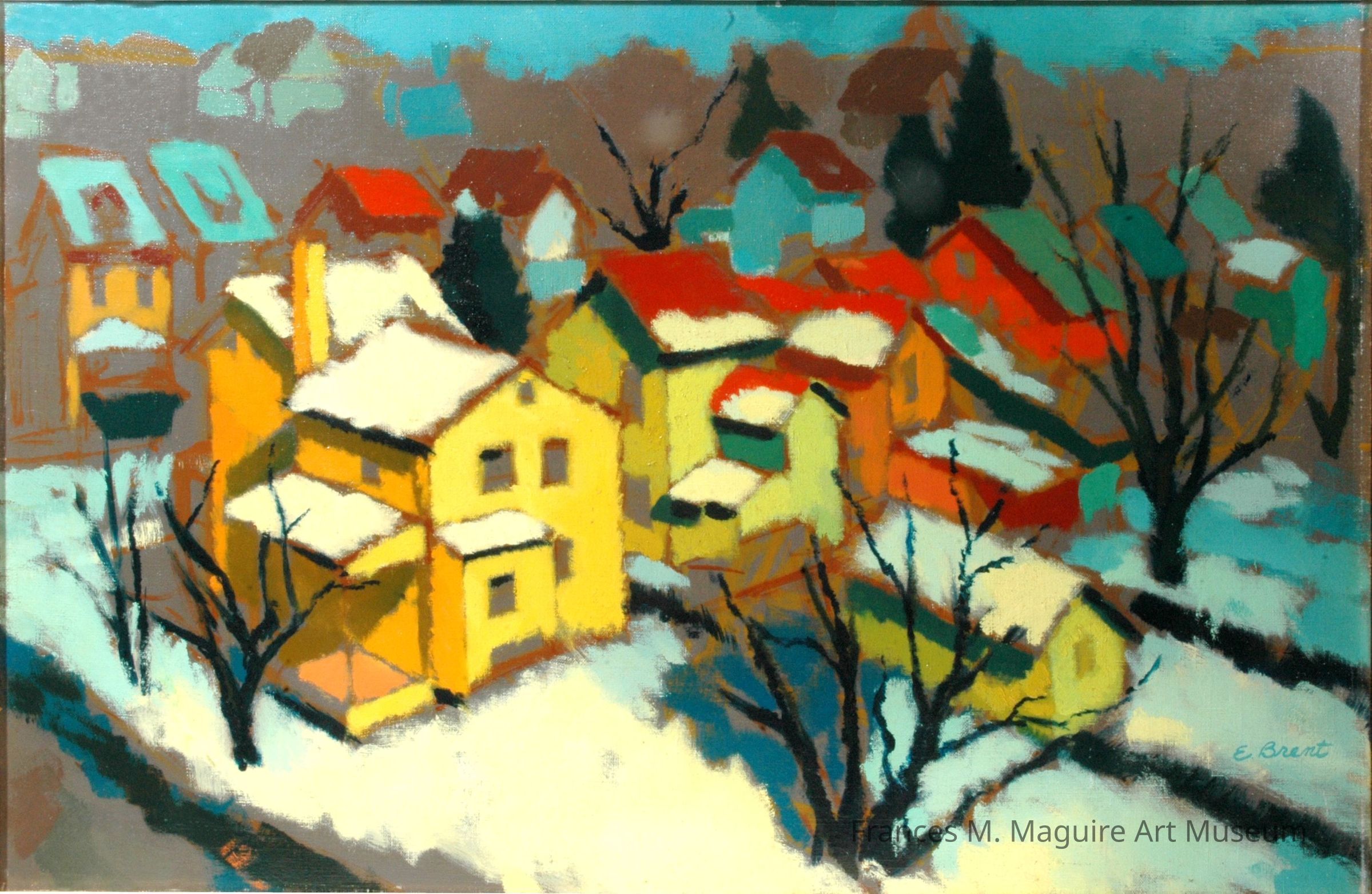 20th-c. oil painting of snow-covered houses.Made/Created