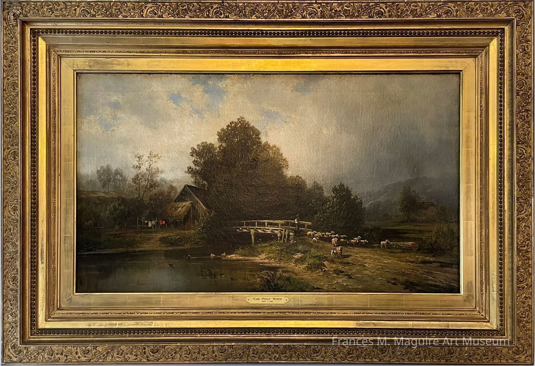 19th-c. landscape painting of a small farm with a person and a flock of sheep in the foreground.
