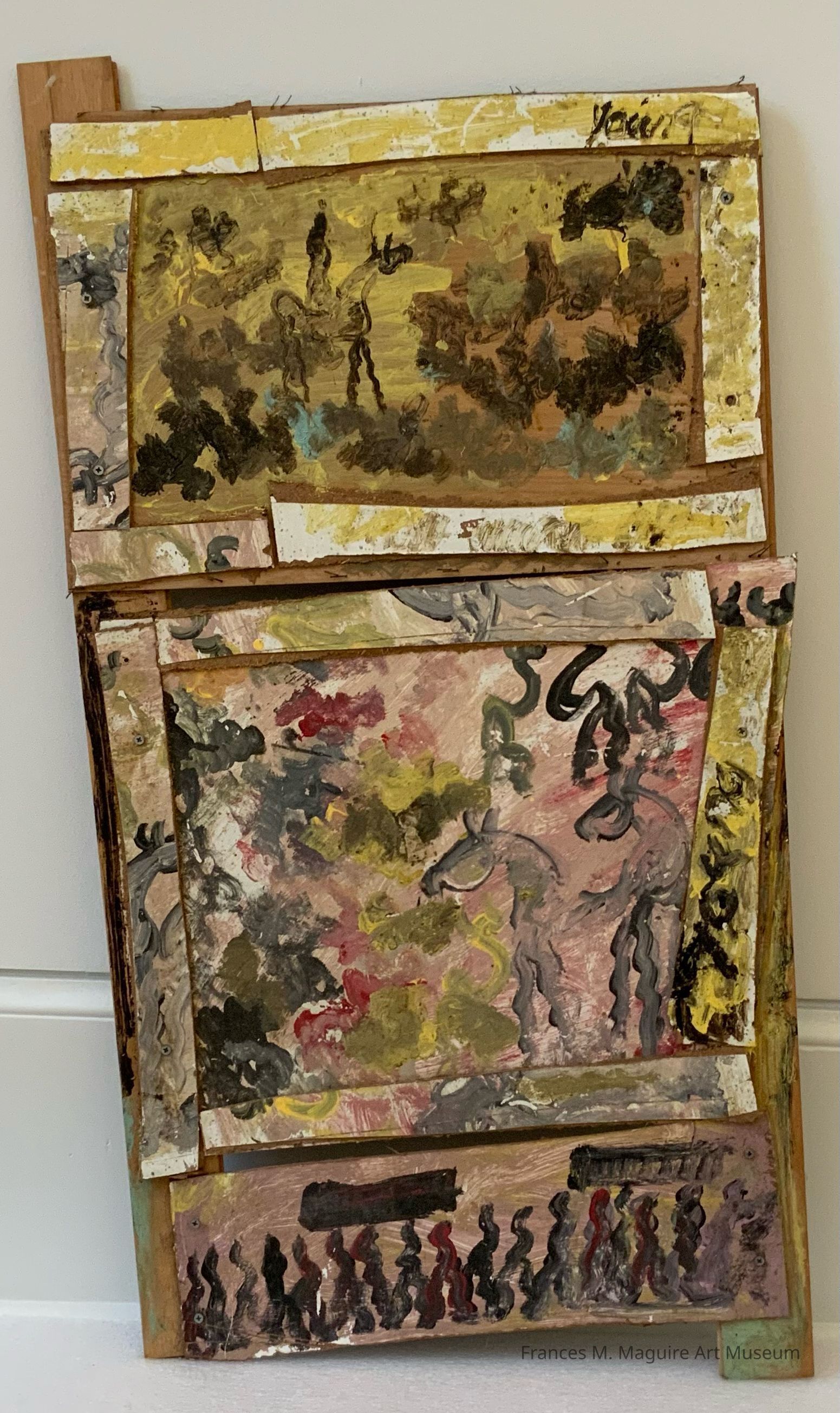 “My feeling was the world might be better if I put up my protests.” Self-taught artist Purvis Young draws attention to the challenges faced by underrepresented urban communities, including racism, violence, and drug abuse. Central to his work is Overtown, a historic black neighborhood in Miami, Florida, where Young lived most of his life. Once a thriving community, in the 20th c. Overtown became increasingly isolated and neglected in the wake of Miami’s urban renewal campaigns. Young made his works using scraps of paper, wood, fabric, and various industrial items he found at construction and trash sites in Overtown. His distinctive style combines these raw materials with expressive brushwork and a visual vocabulary that often features protesters, pregnant women, horses, enslaved figures, warriors, and large, looming eyes. Claiming “I paint what I see,” Young’s artworks manifest his personal experiences in Overtown. They also stress the significance of themes such as death, adversity, and hope to all humanity.