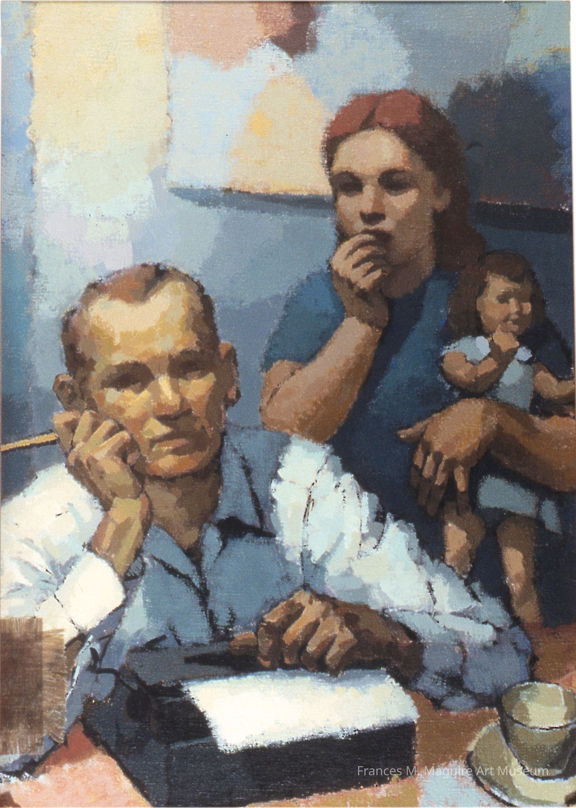 20th-c. oil painting of a man at a typewriter and a girl holding a doll. Another painting is on the front side of this piece.Made/Created