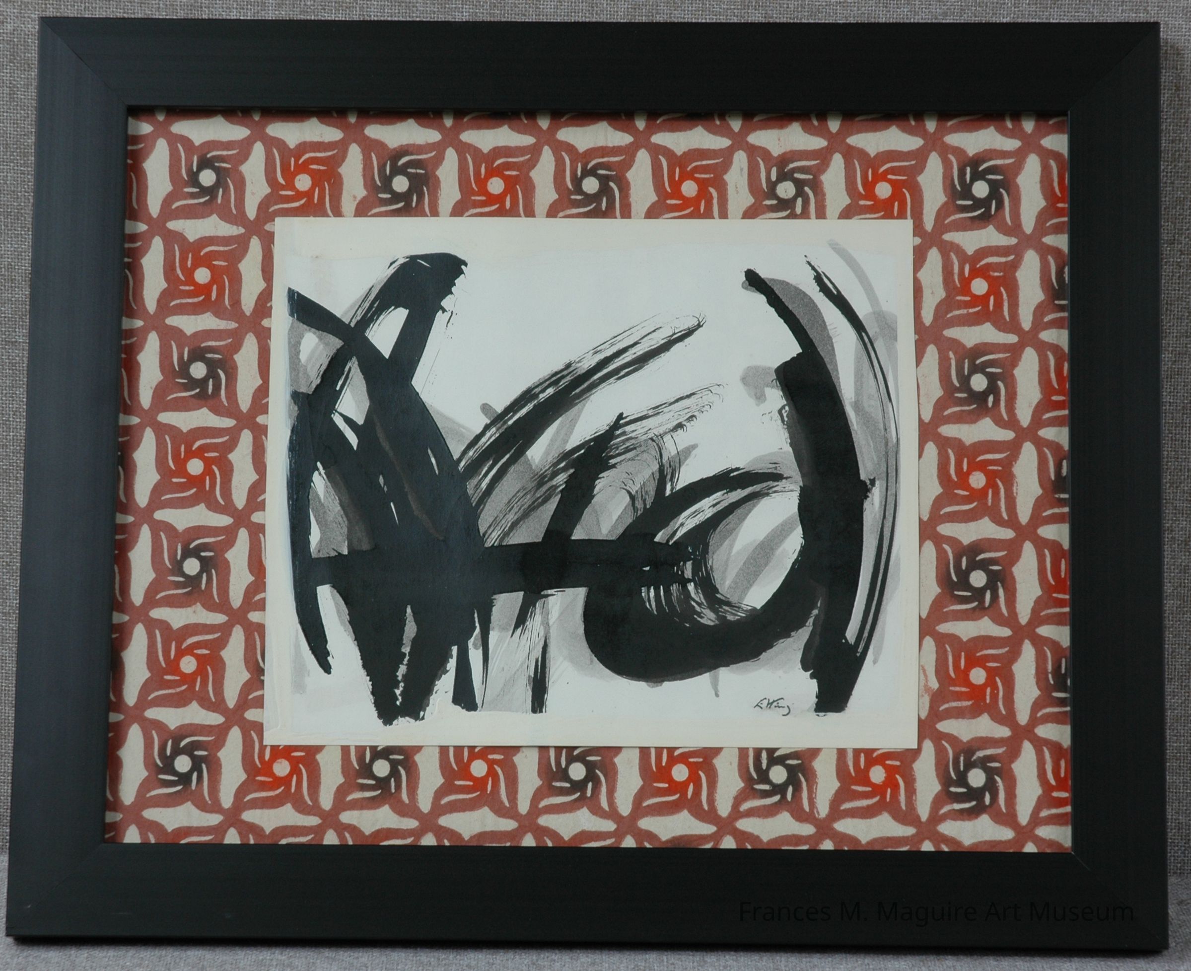 Black watercolor painting on red patterned paper