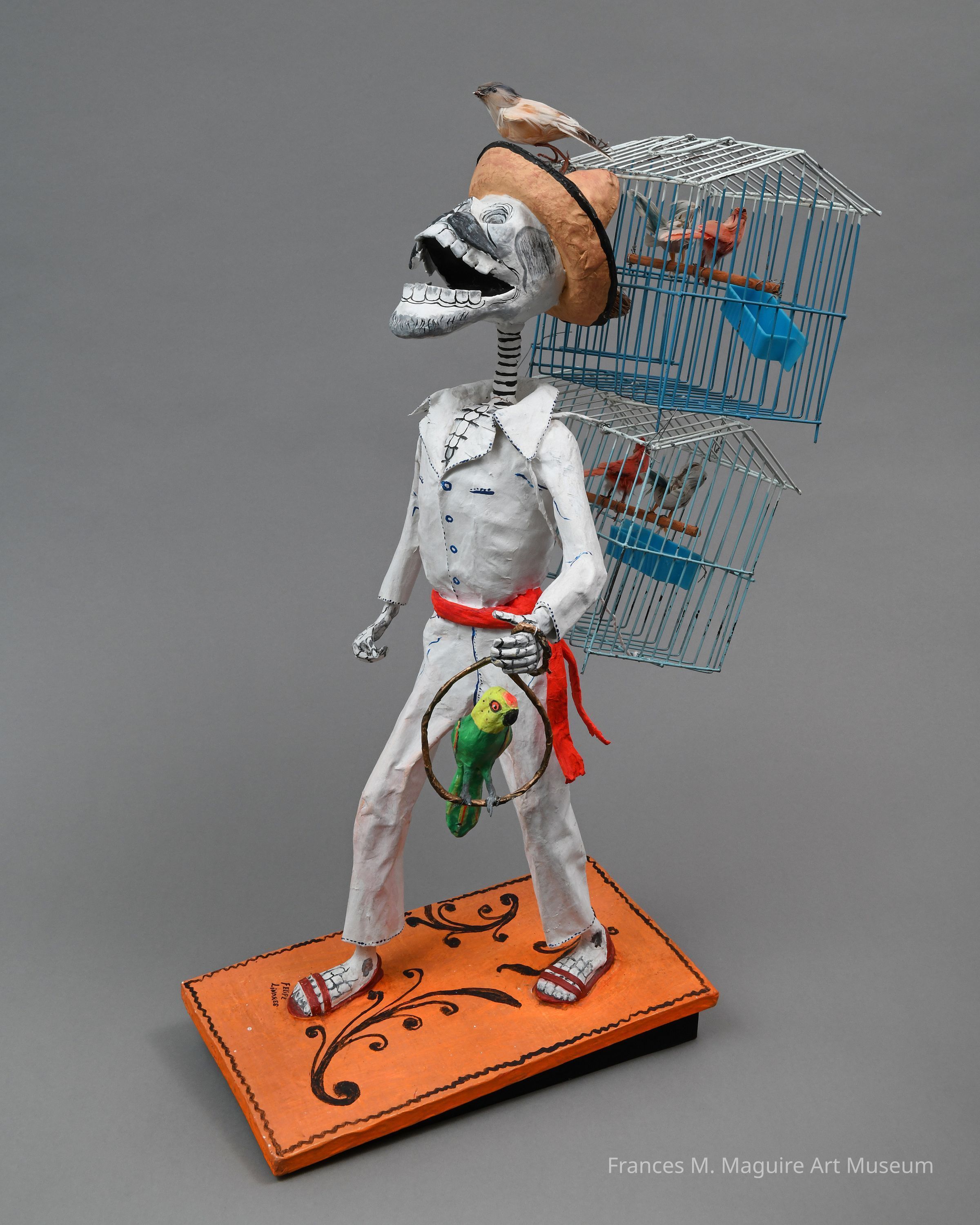 20th-c. Mexican mixed media and papier-mâché sculpture of a Veracruzan skeleton man selling birds. The skeleton has a parakeet on a hoop and cages on his back.Artwork Details