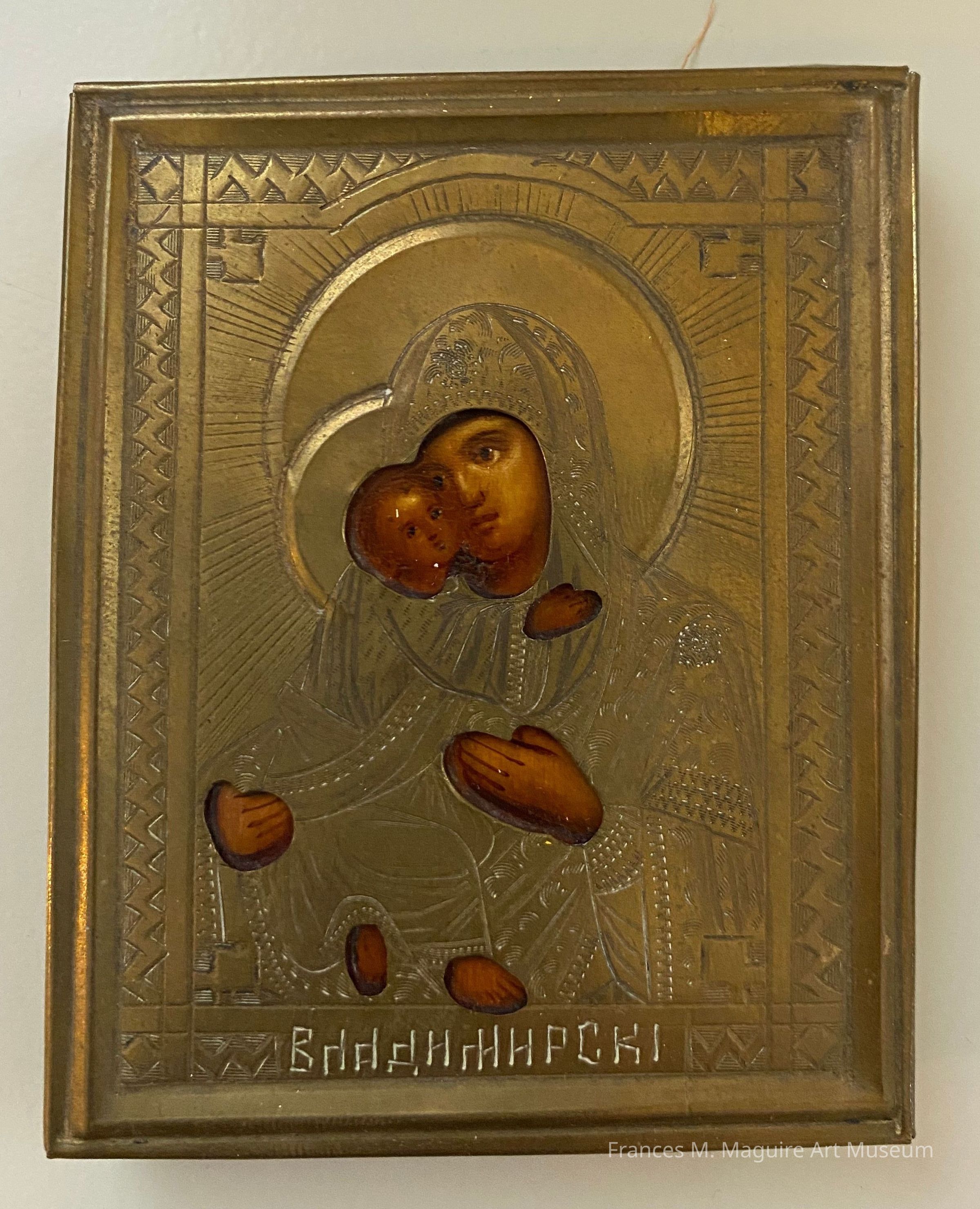 Russian icon of the Virgin Mary holding the Christ Child under a gold or brass riza.