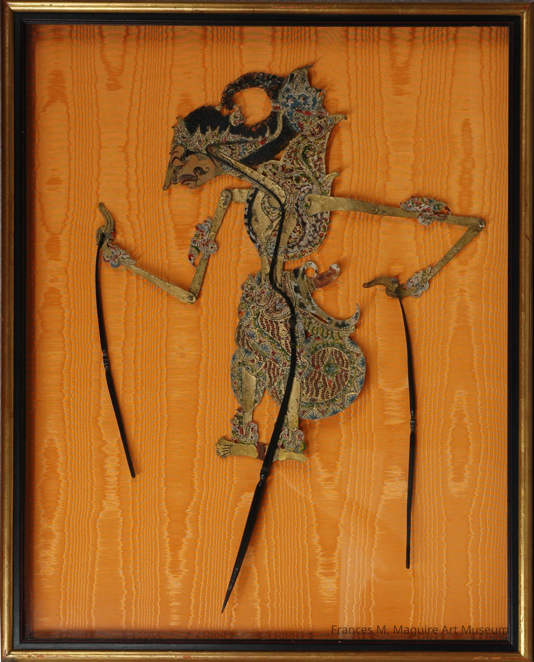 19th c. Javanese shadow puppet (wayang golek) of Damarwulan, a hero in Javanese legend. Made of wood, water buffalo hide, pigment, gold leaf, and metal chain.Dimensions
