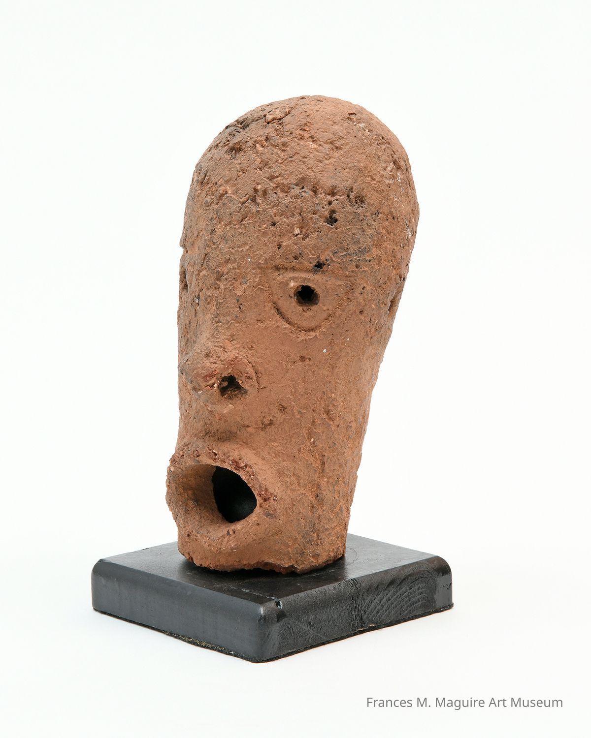 A coarse, quartz-tempered clay figure with an expressive face, half-circle eyes, a naturalistic nose with delineated nostrils, and a wide-open mouth, from the Nok culture and people in modern-day Nigeria. Such figures may represent the beginnings of West African art.Made/Created