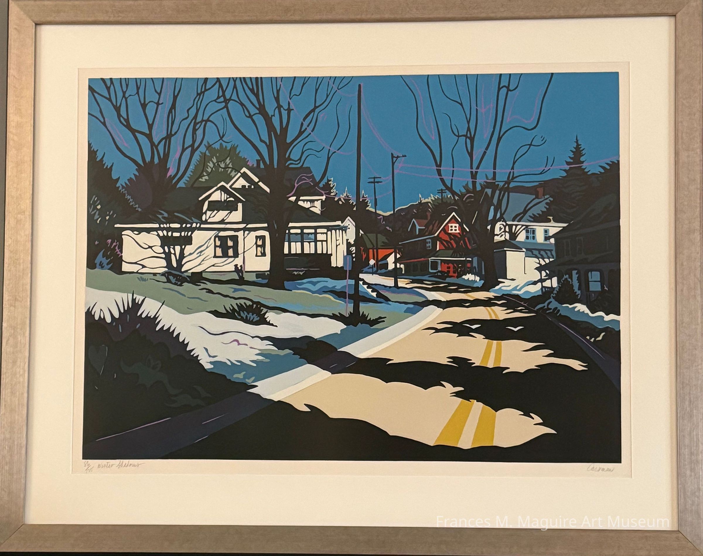 20th-c. screen print in colors of a street scene with bare trees and long shadows. Ed. 86/125