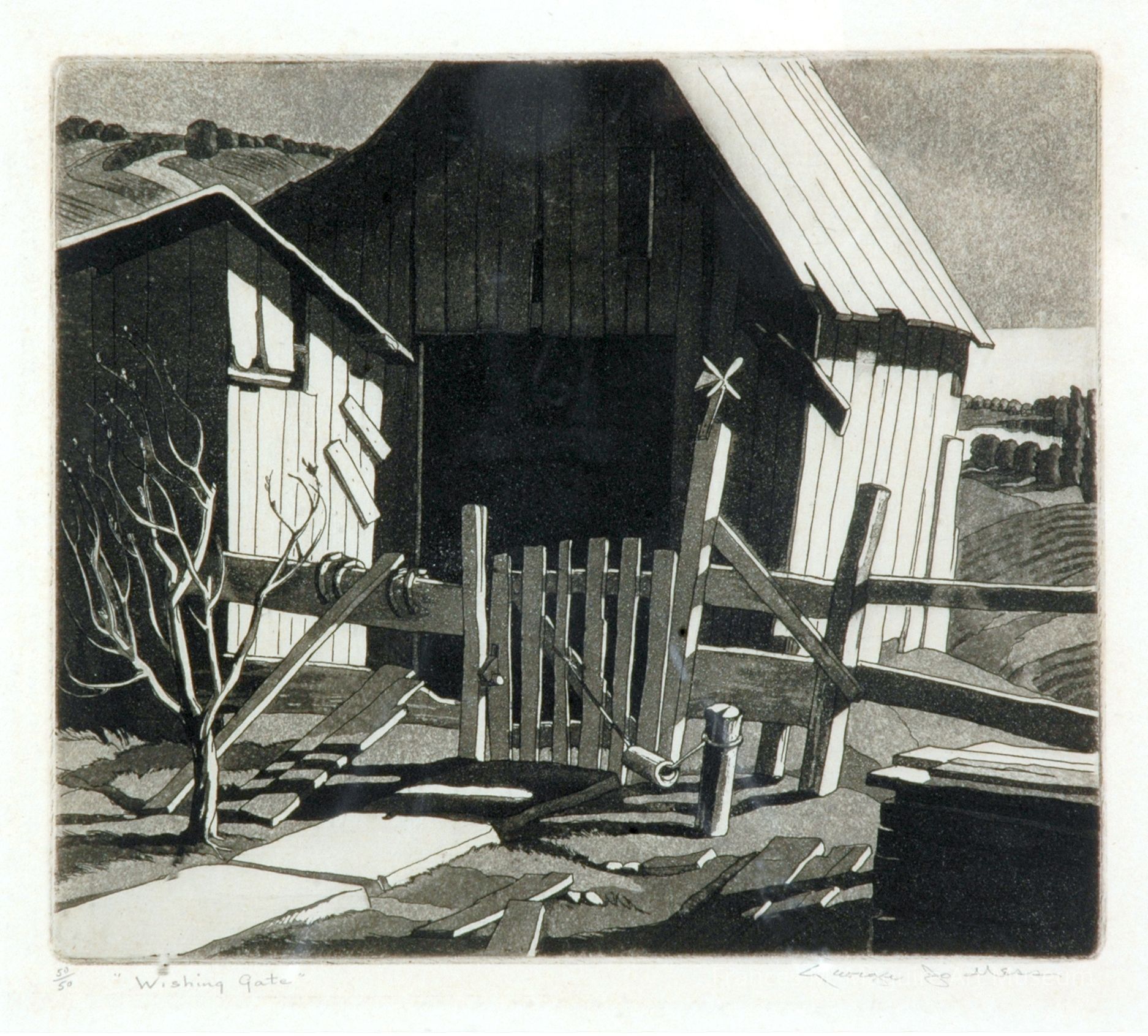 20th-c. woodblock print of wooden gate in front of a barn. Ed. 50/50.Made/Created