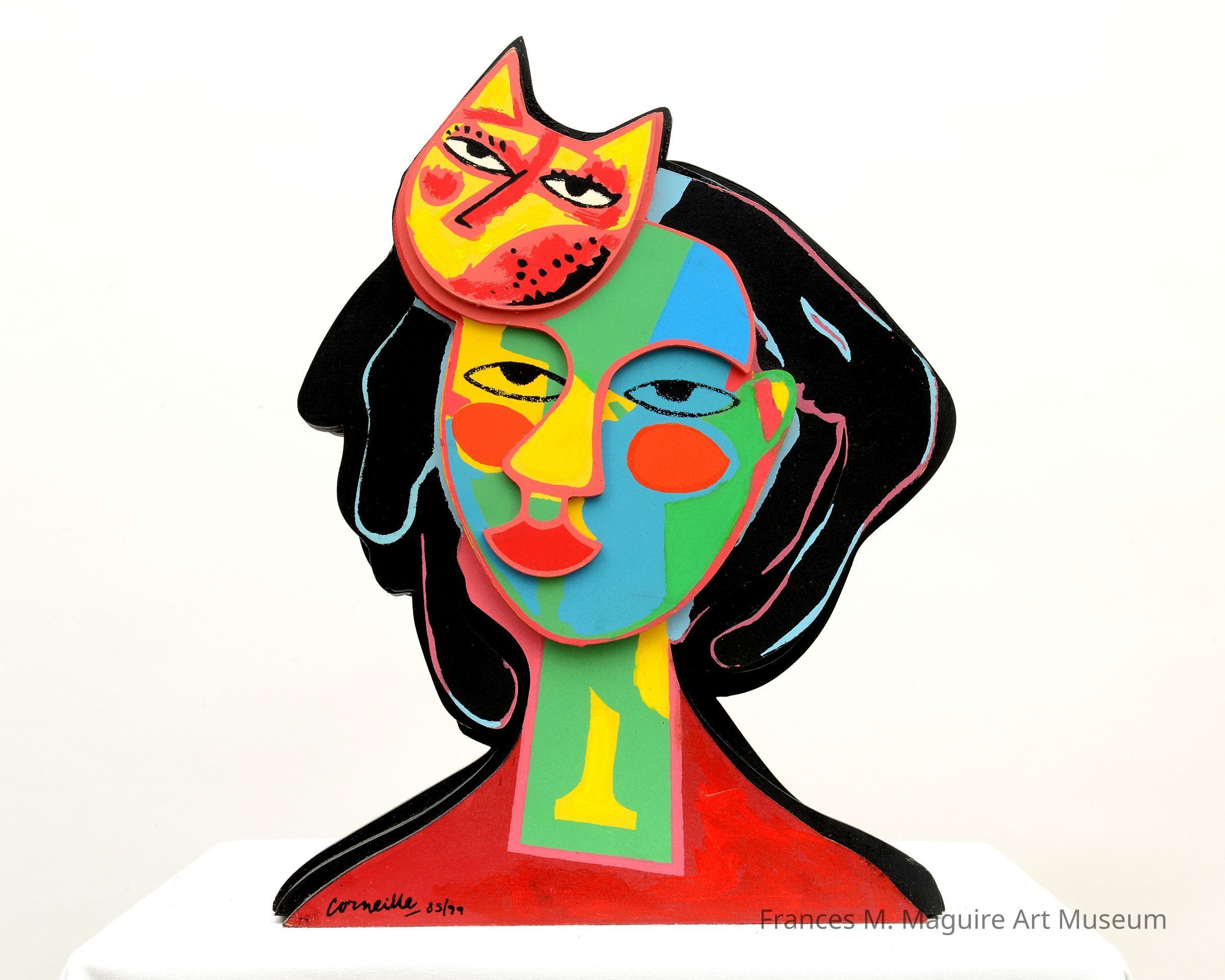 Polychromed wood (plywood) relief of a woman and cat. Signed lower left, edition 85/99.