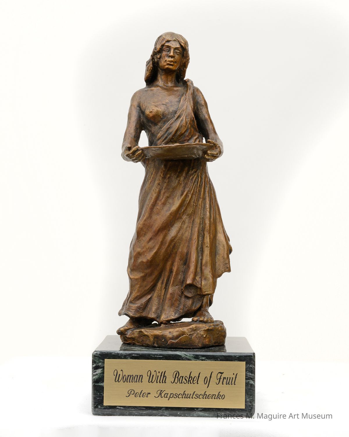 Bronze sculpture of a woman holding a basket of fruit by Peter Kapschutschenko.Made/Created