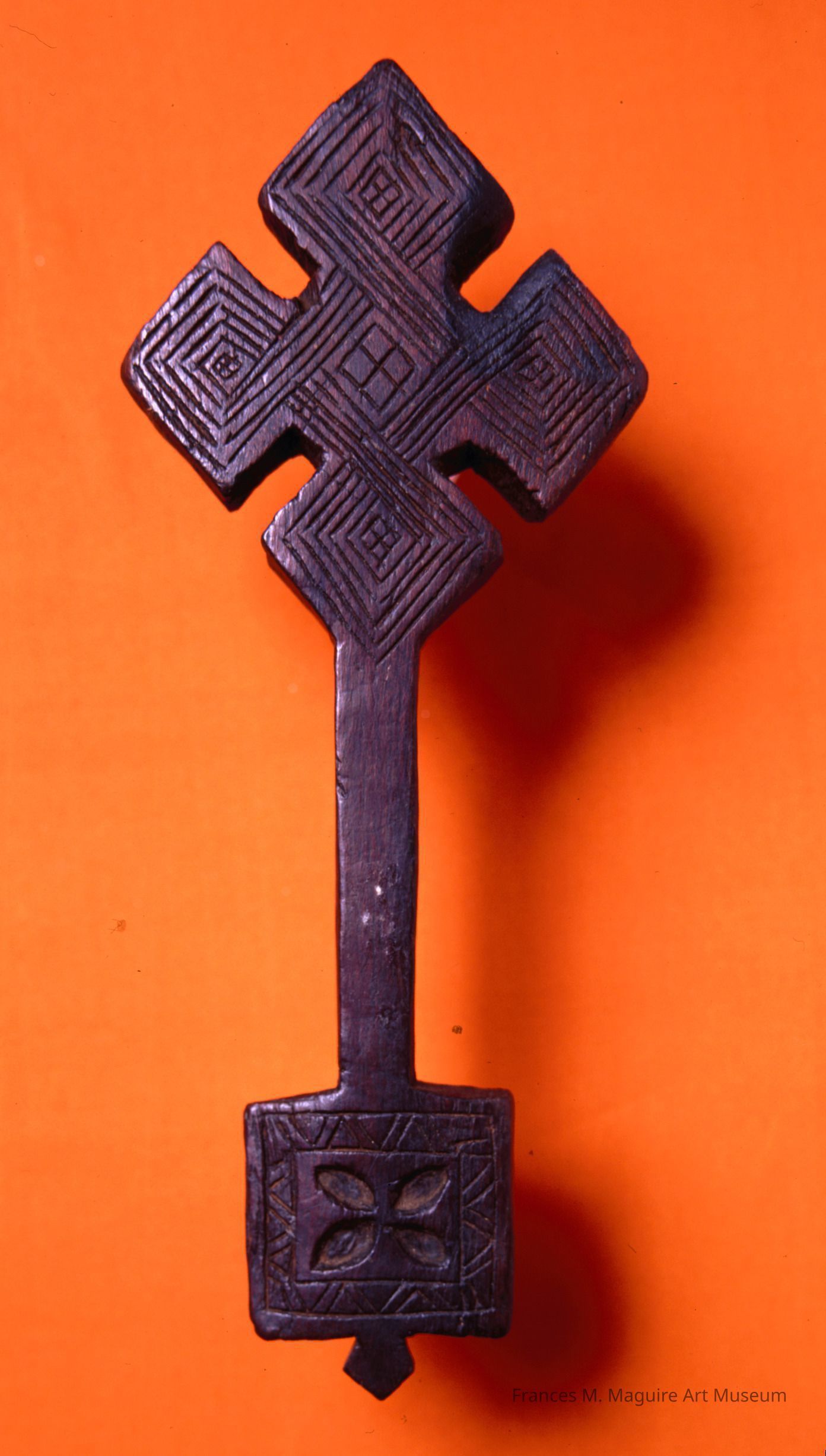 Many Ethiopian crosses are made in the shape of a diamond, such as this example, which is incised with interlace motifs. The rectangle at the base of the handle represents a tabot, a wood or stone carving symbolizing the Ark of the Covenant and the tablet of the Ten Commandments, which according to Ethiopian tradition are located in the ancient city of Aksum. Every Ethiopian church has a tabot in the inner sanctuary that is accessible only to priests. Small crosses like this well-worn example are held almost continually by a priest and are used to bless the faithful with a touch to the forehead.