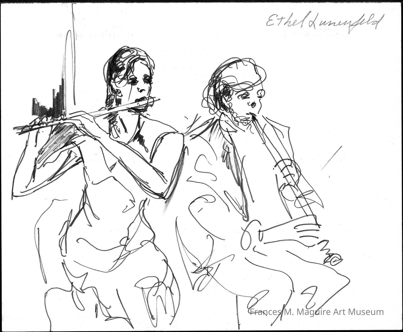 20th-c. marker drawing of a flutist and clarinetist, likely in the Philadelphia Orchestra.Made/Created