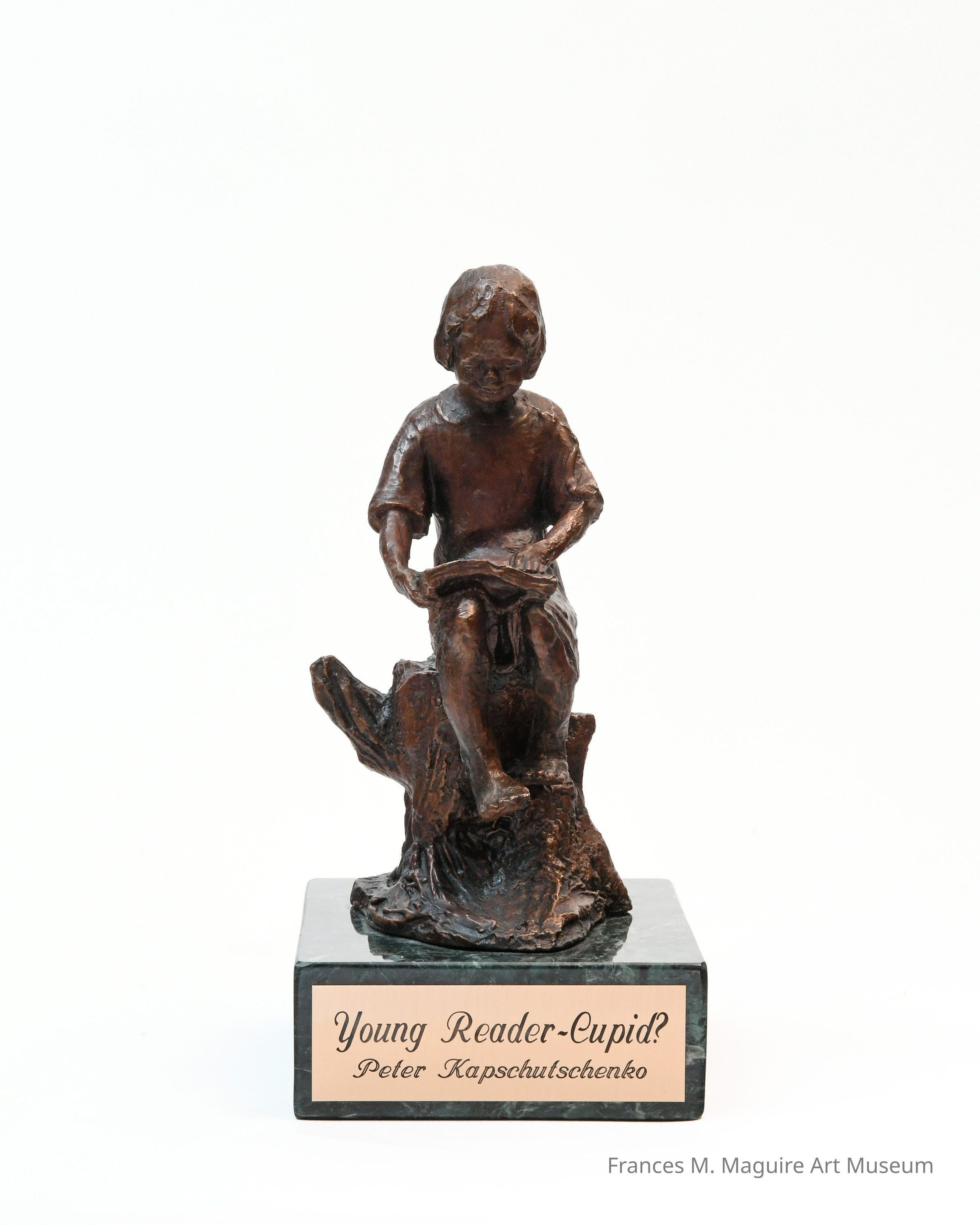 Bronze sculpture of a child reading while sitting on a tree stump.