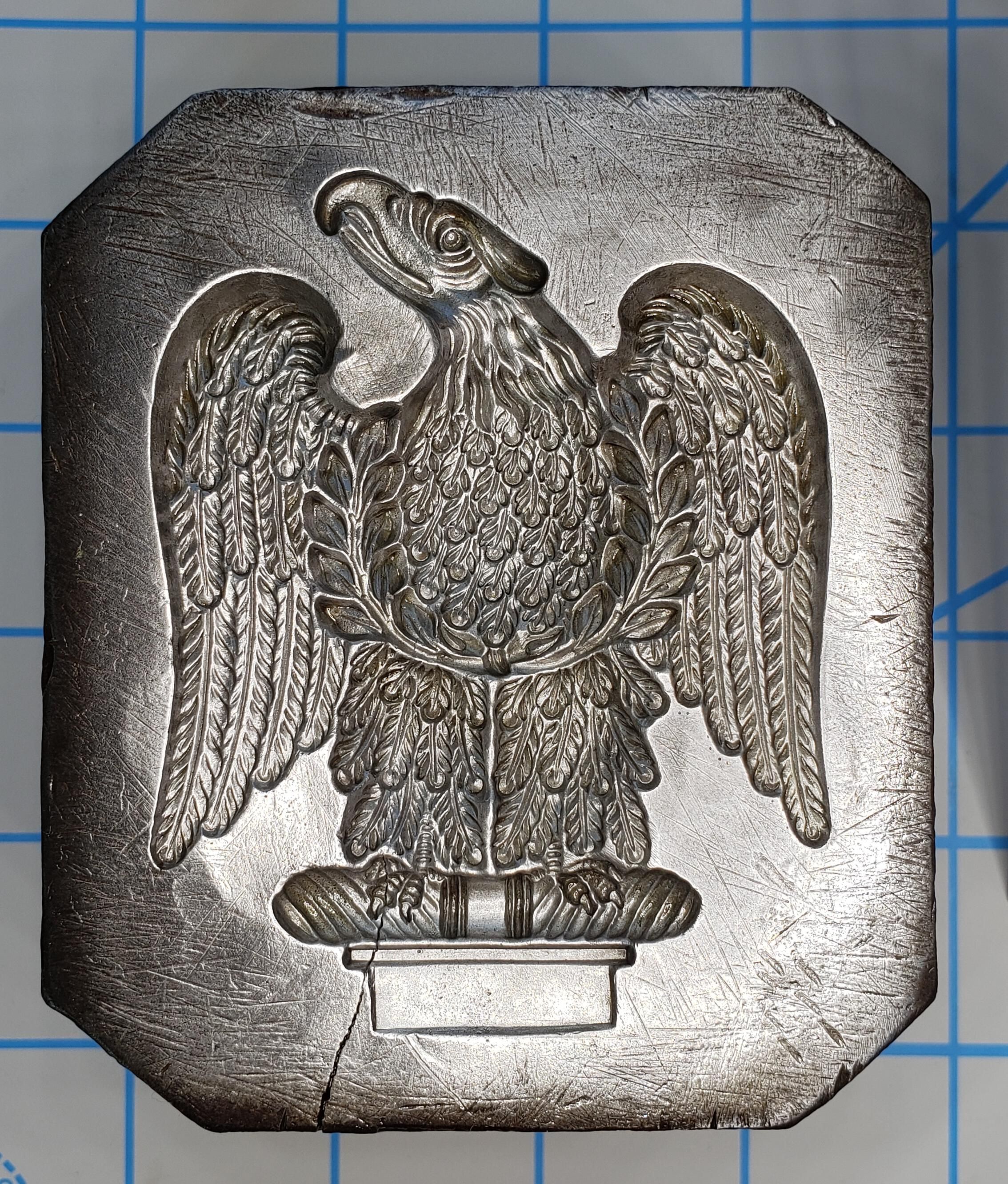 This die was used to make the eagle plate that was attached to the front center of a dragoon shako (hat). There was a separate sunburst metal plate that went between the eagle and the shako.Made/Created