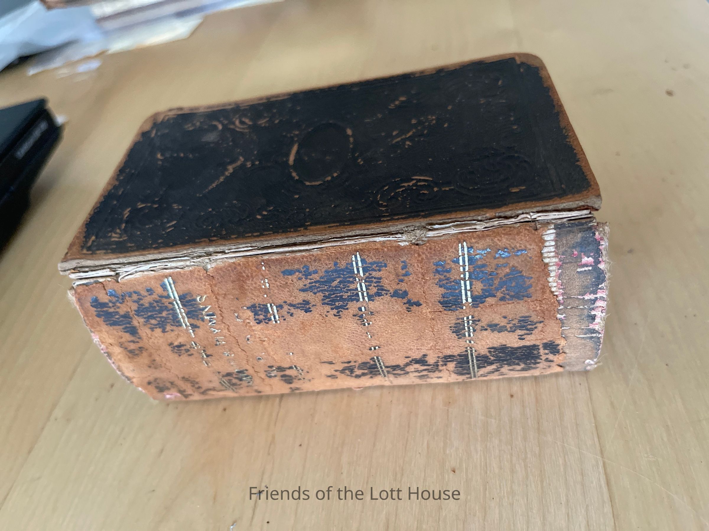 Small but thick black book with a title on spine that is obscured by wear. Inside indicates it is the "Psalms and Hymns"Collection