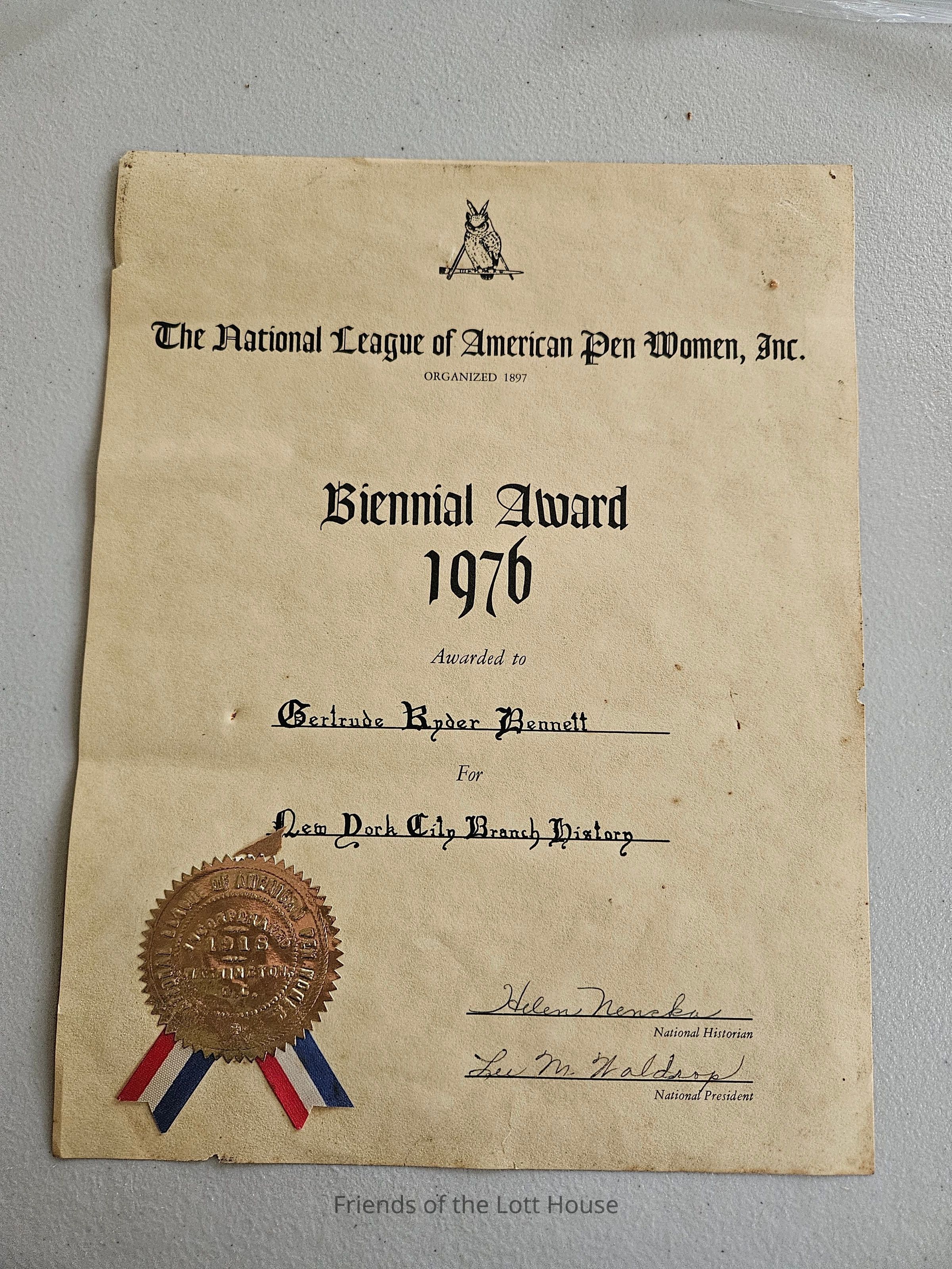 Biennial Award 1976 to Gertrude Ryder Bennett for NYC Branch HistoryCollection
