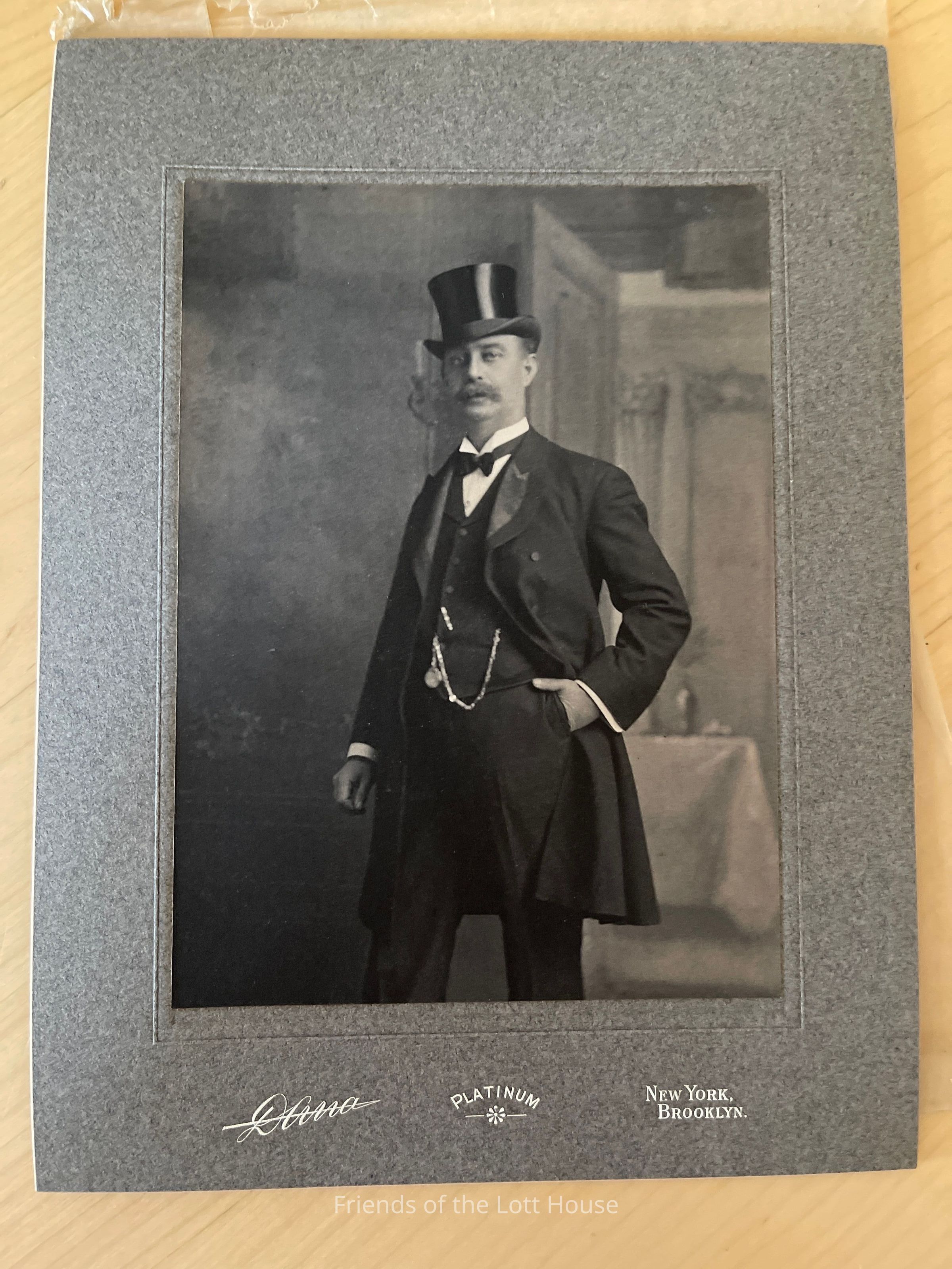 Photograph of a man standing, wearing formal wear including a top hat. Has left hand in pocket. In a paper sleeveCollection