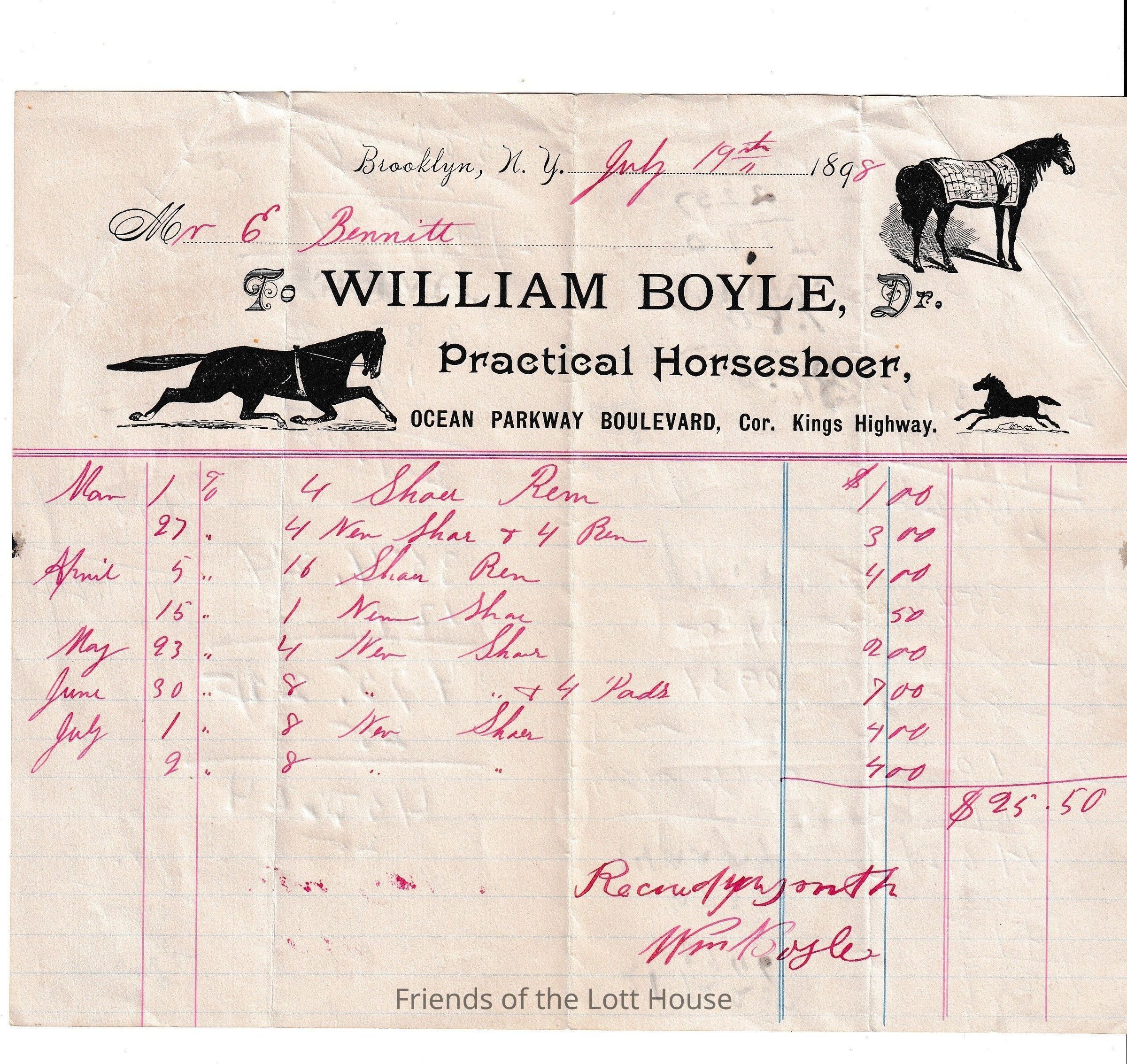 Receipt from Dr. William Boyle, Practical Horseshoer on Ocean Parkway Boulevard, Cor. Kings Highway issued on July 19th, 1898 towards a Mr. BennettCollection