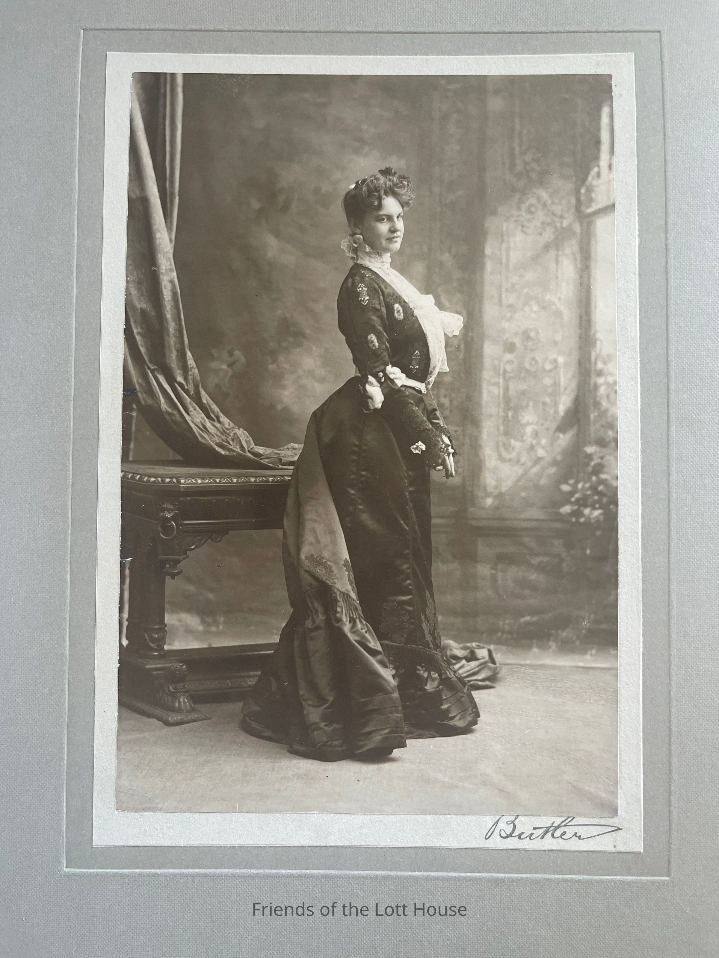 Photograph of a woman in a dark dress standing next to a table.Collection