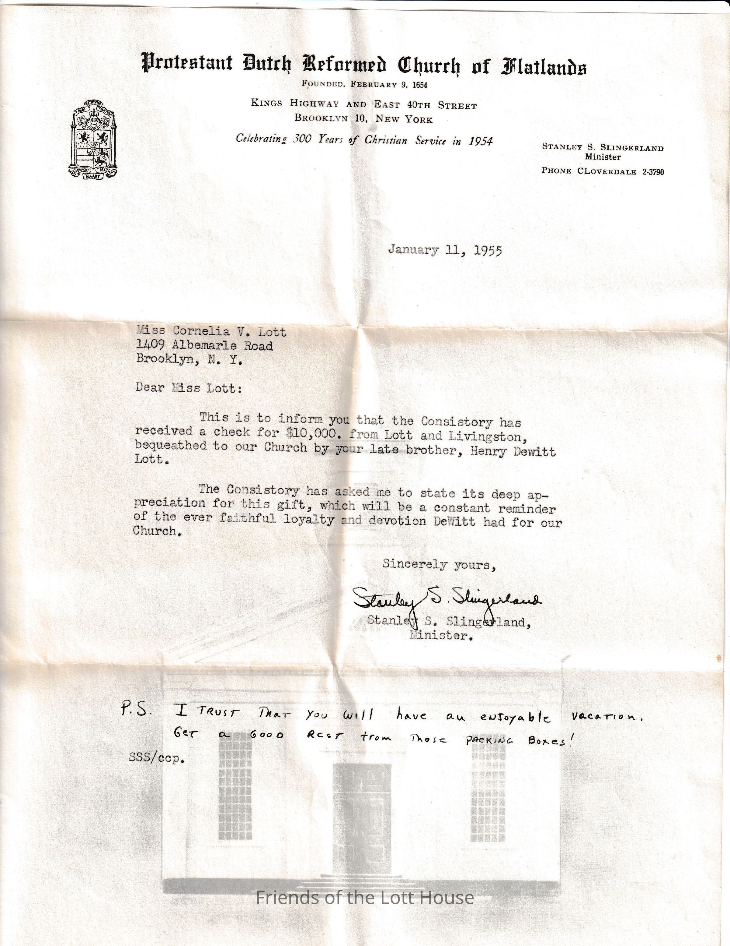 letter thanking Cornelia and late brother for donation, Protestant Reformed Church of Flatlands, January 11, 1955Collection