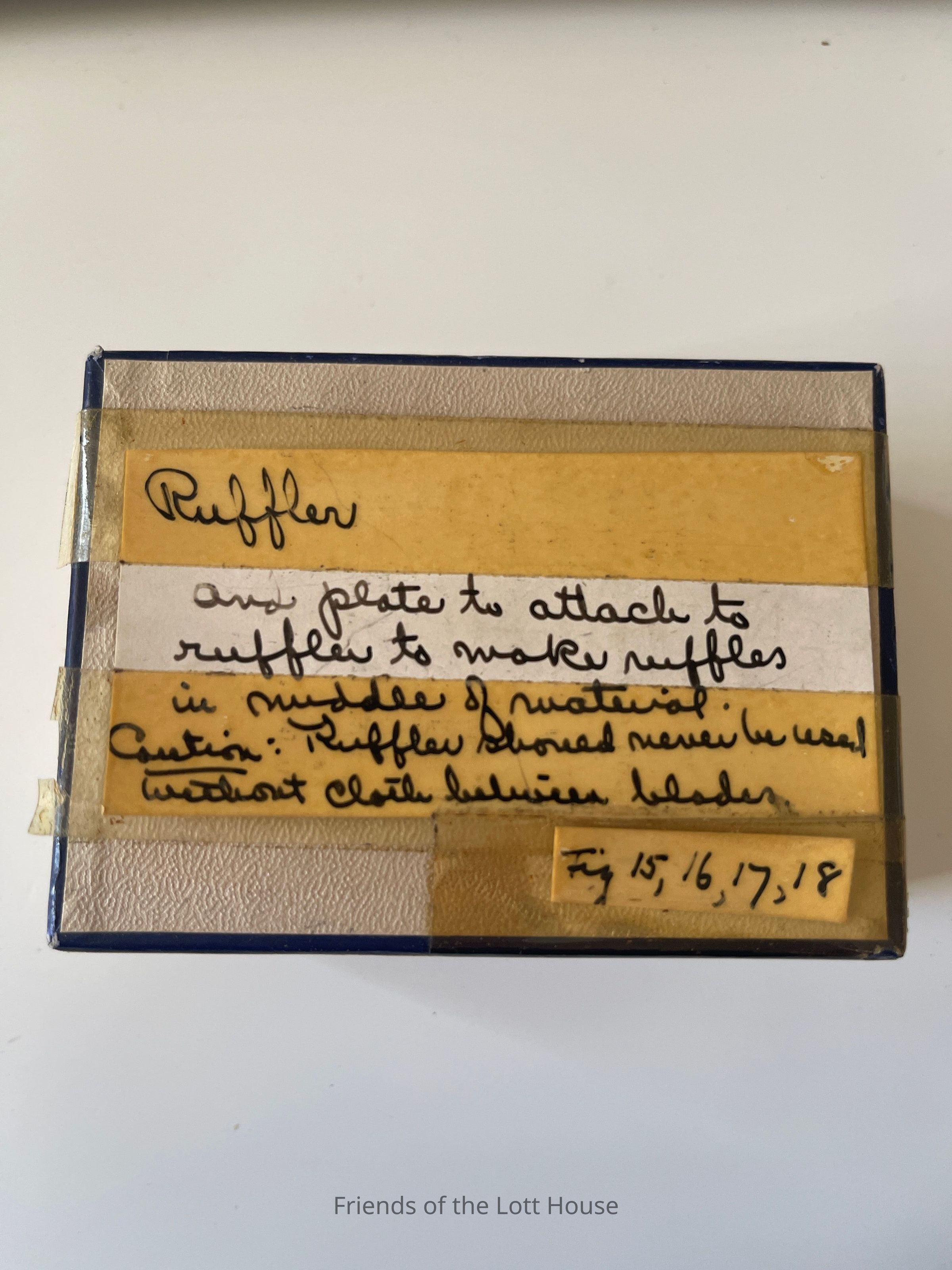 Add plate to attach to ruffer to make ruffles in middle of material. Caution: Ruffler should never be used without cloth between bladesContext