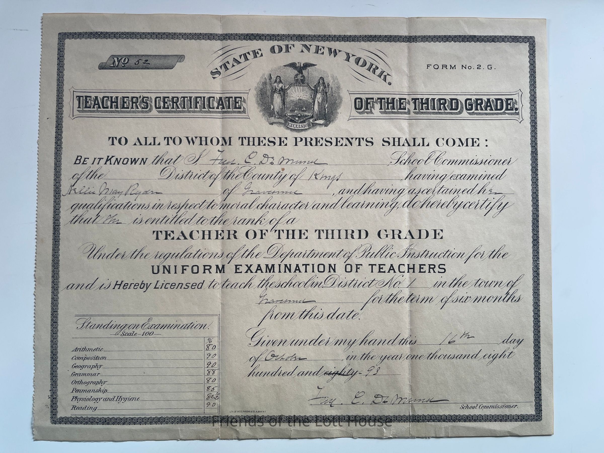State of New York Teachers Certificate of the Third Grade for Nellie May Ryder 1893Collection