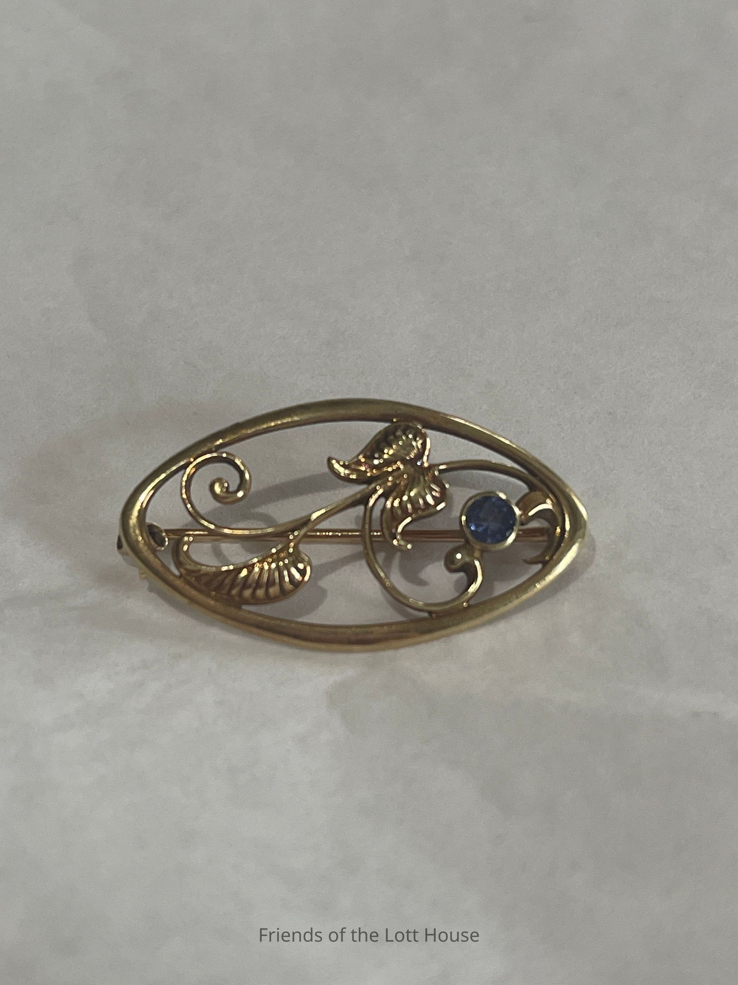 oval pierced pin with floral decoration and sapphire to center, marked “14k”Category