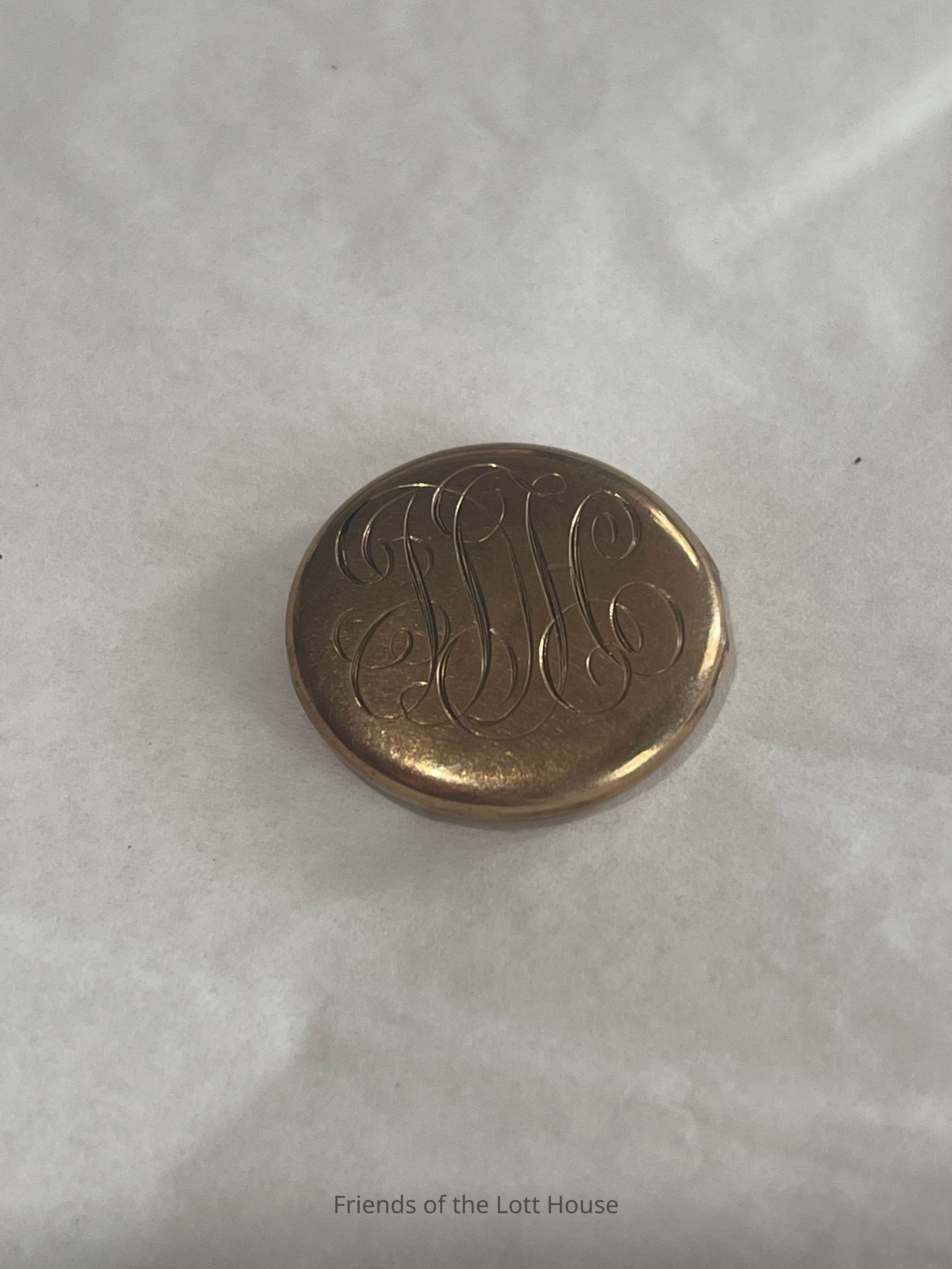 10k gold round locket with monogram “JGH”. Photo inside is of Jennie Grace (Ditmas) Harrison. Could be a memorial item or other memento.Category