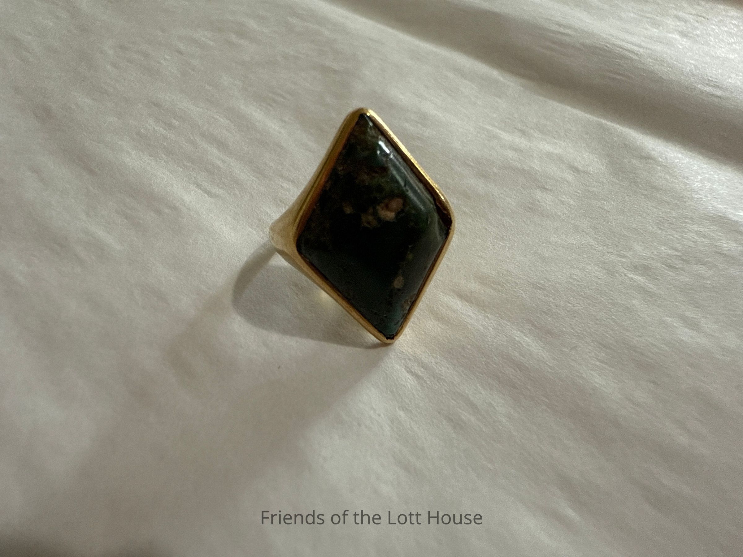 18k gold ring with green stone to center in diamond shape setting, marked “18k”.Category