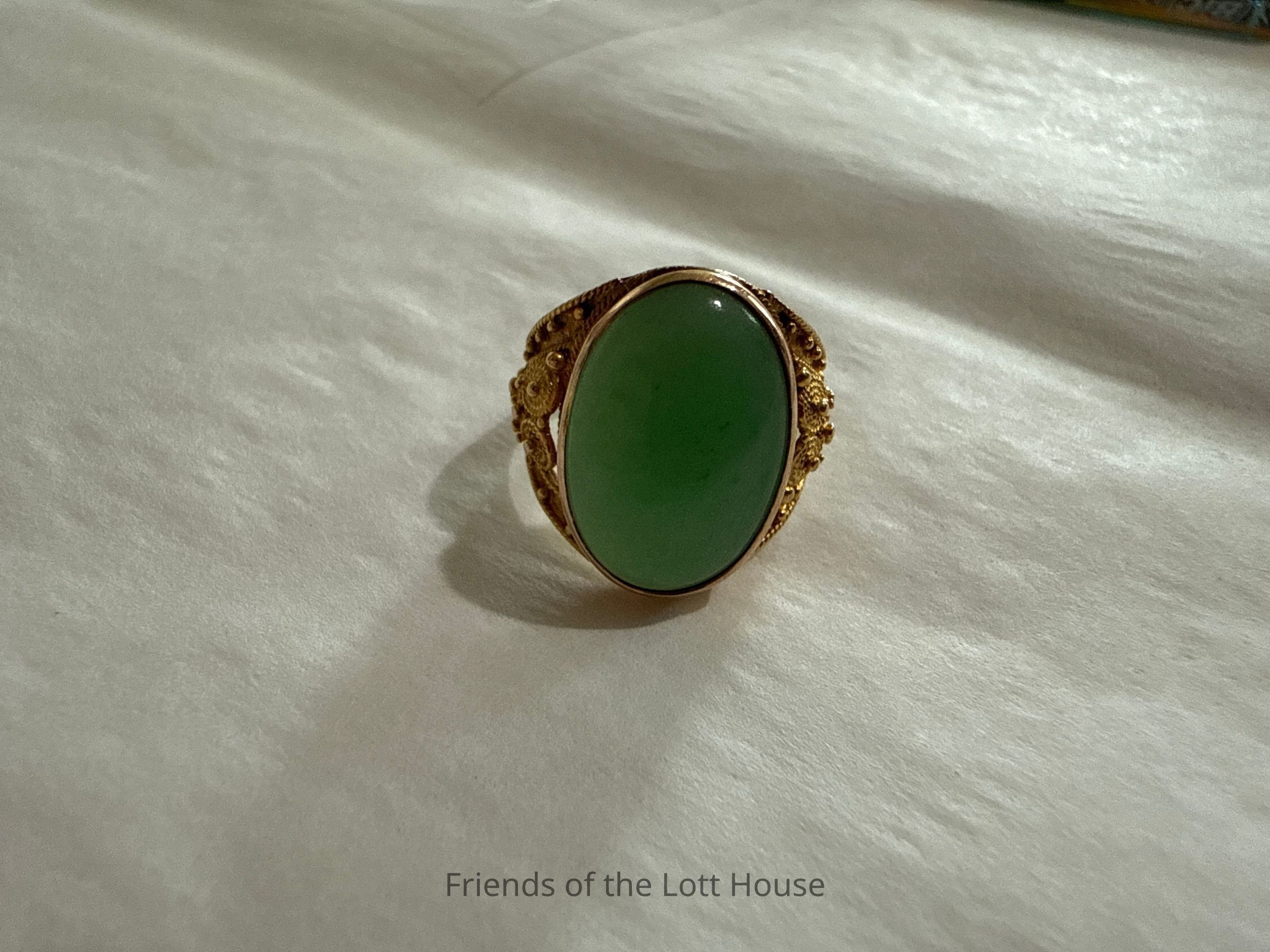 18K gold ring with oval green stone to center with pierced and applied scroll decoration, (band resized).Category