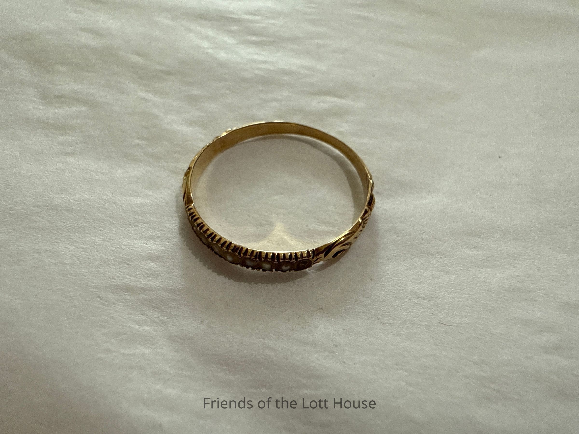 14k gold band with (9) seed pearls to center and foliate decoration to band. Design matches LH2019.22Category