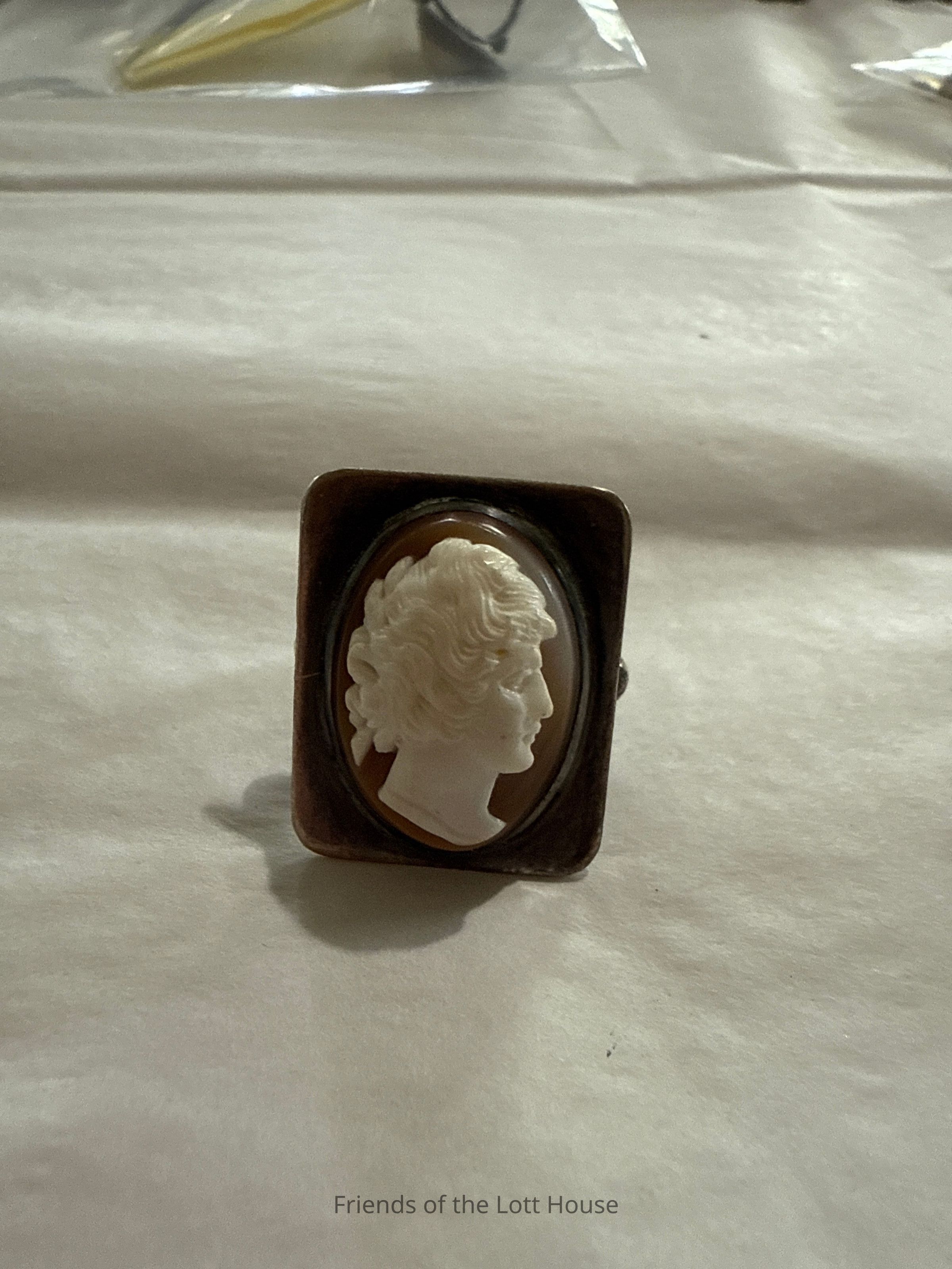Cameo ring; oval reddish-brown cameo with central profile of a Greco Roman figure in a square setting.Category
