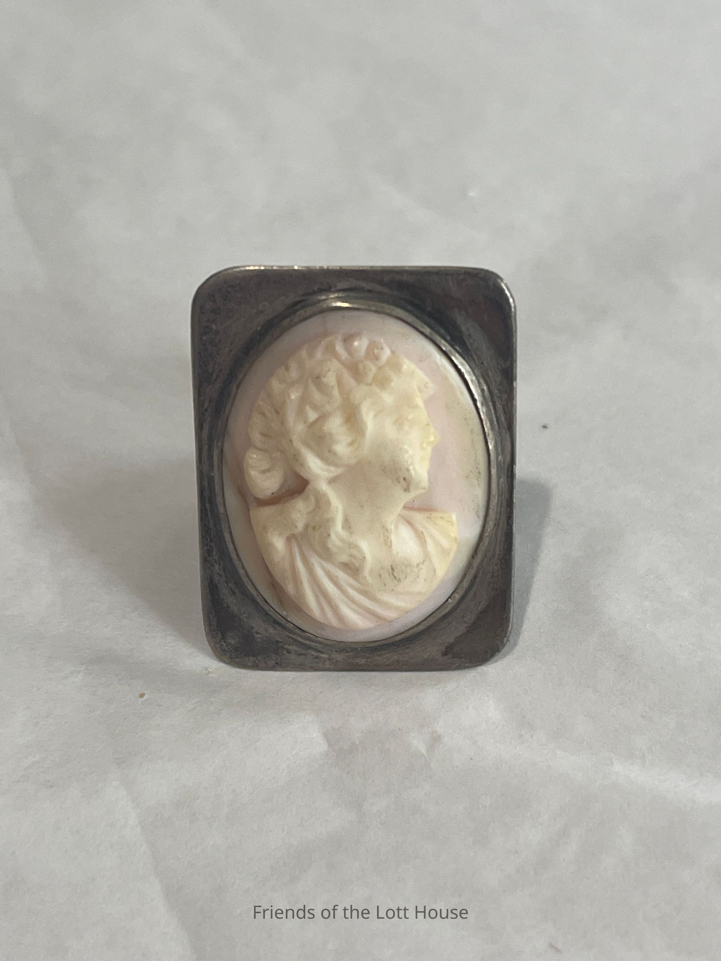Small cameo ring; oval pink shell cameo with profile figure of a woman in a square setting.Category