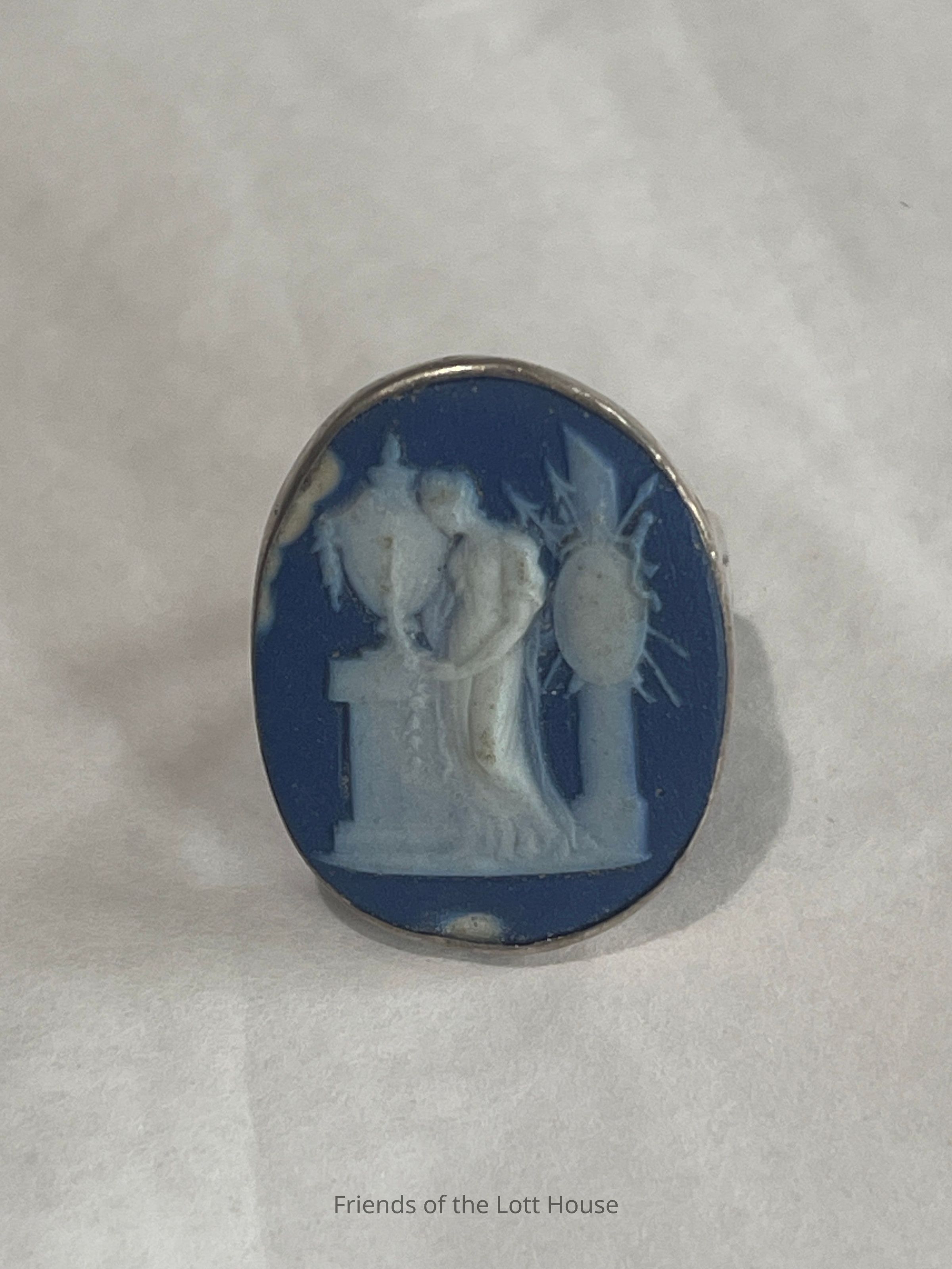 Oval Wedgwood style cameo set in a ring; blue stone with white Greco Roman figure of a woman with an urn on pedastal.Category