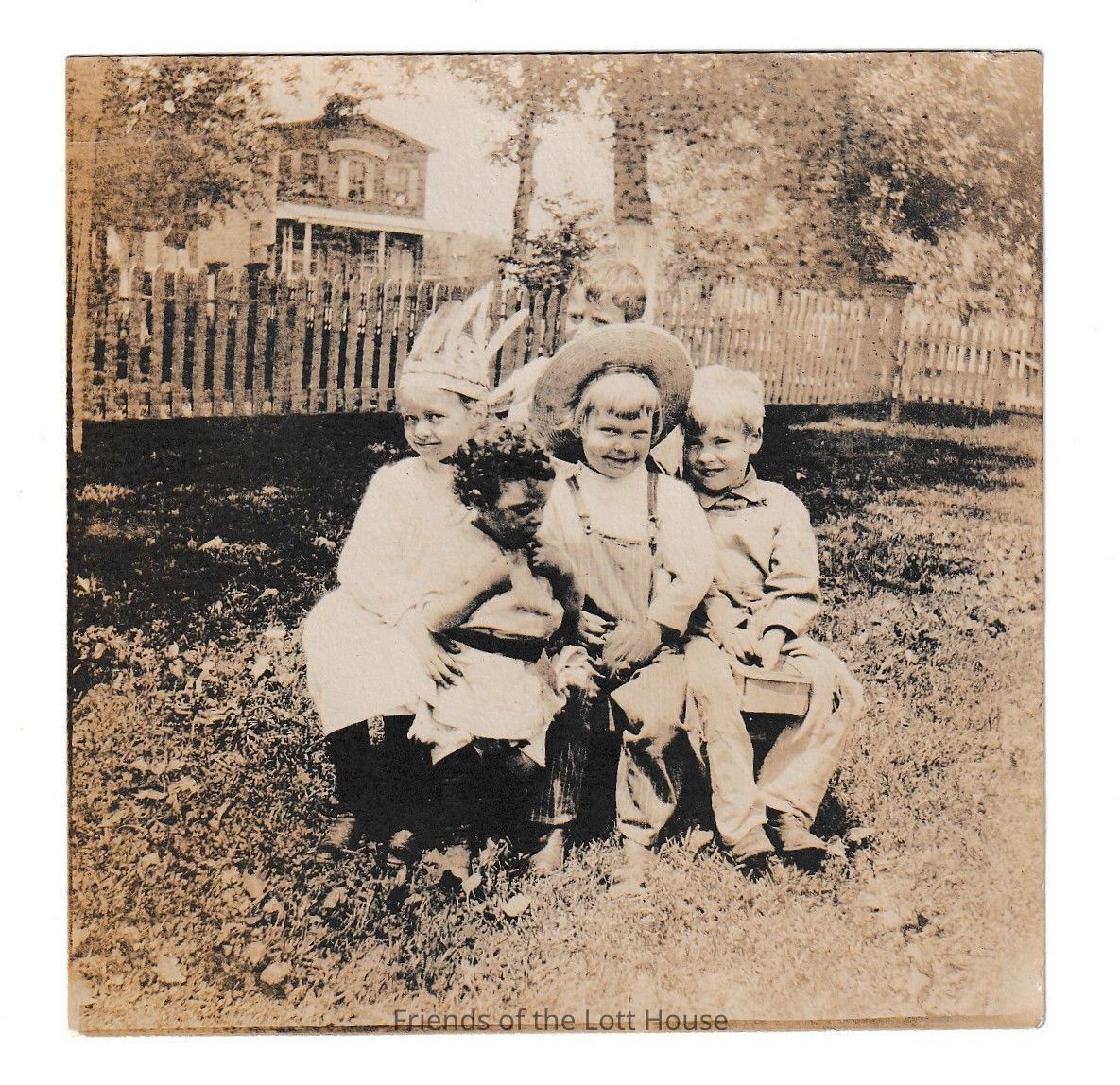 Gertrude Ryder Bennet and her friends in her grandfather's pasture. Center: Gertrude's cousin, Edgard Ryder and Herbert Ryder, his brother. Fred's store in the backgroundCollection