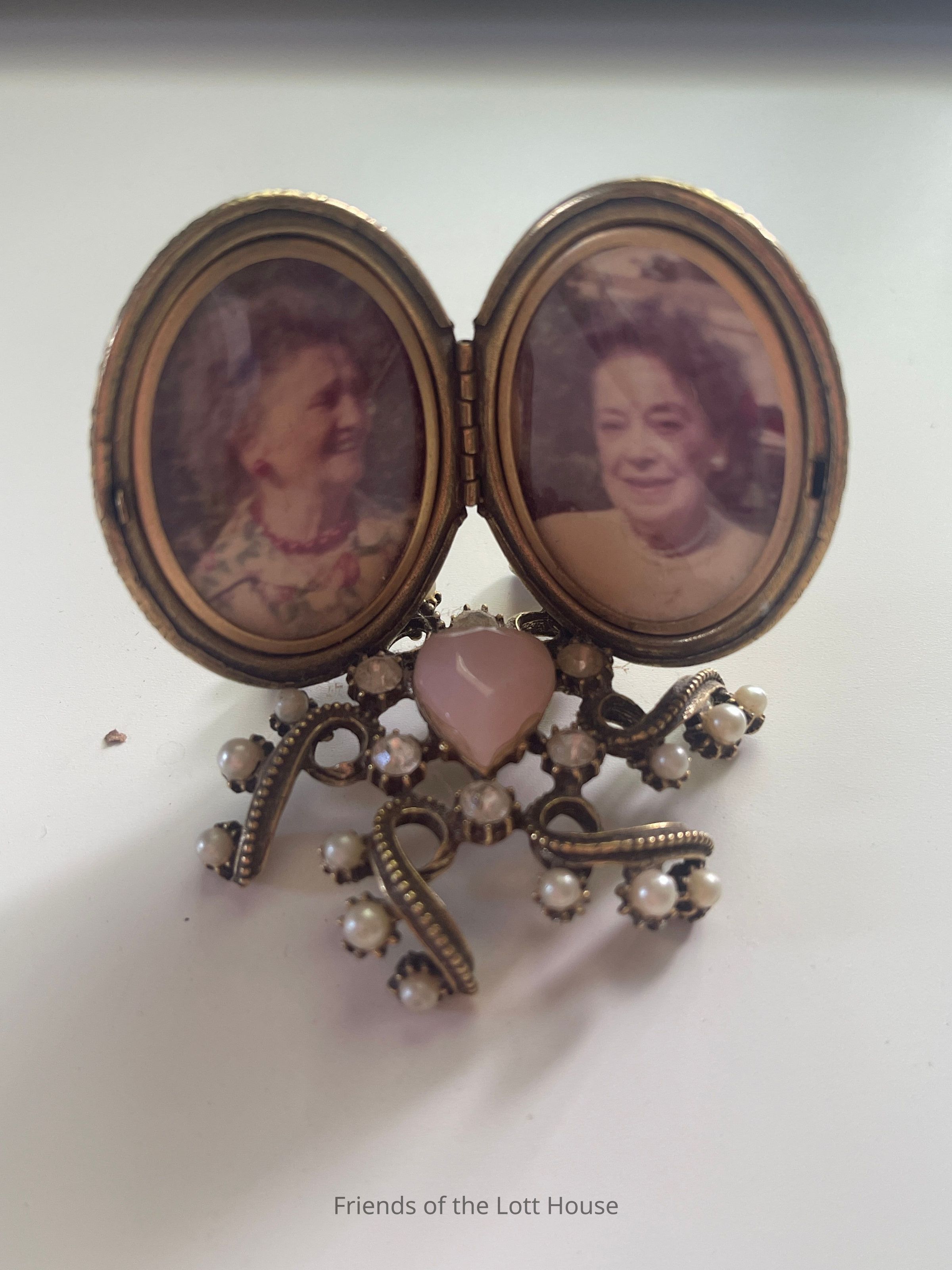 Small locket with photograph of two women on a small stand with faux pearls. Cornelia Lott on the left.Collection