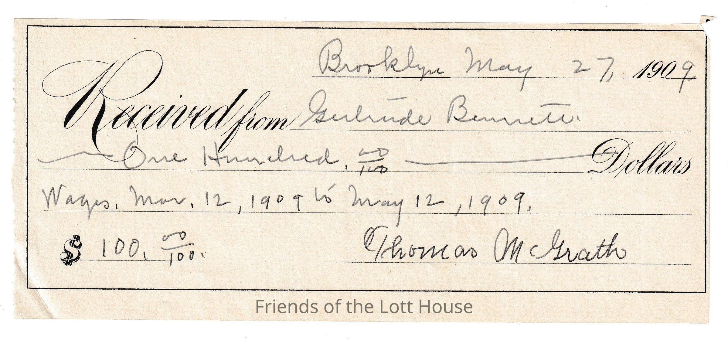 Check for $100 issued to Thomas McGrath by Gertrude Bennett on May 27th, 1909Collection