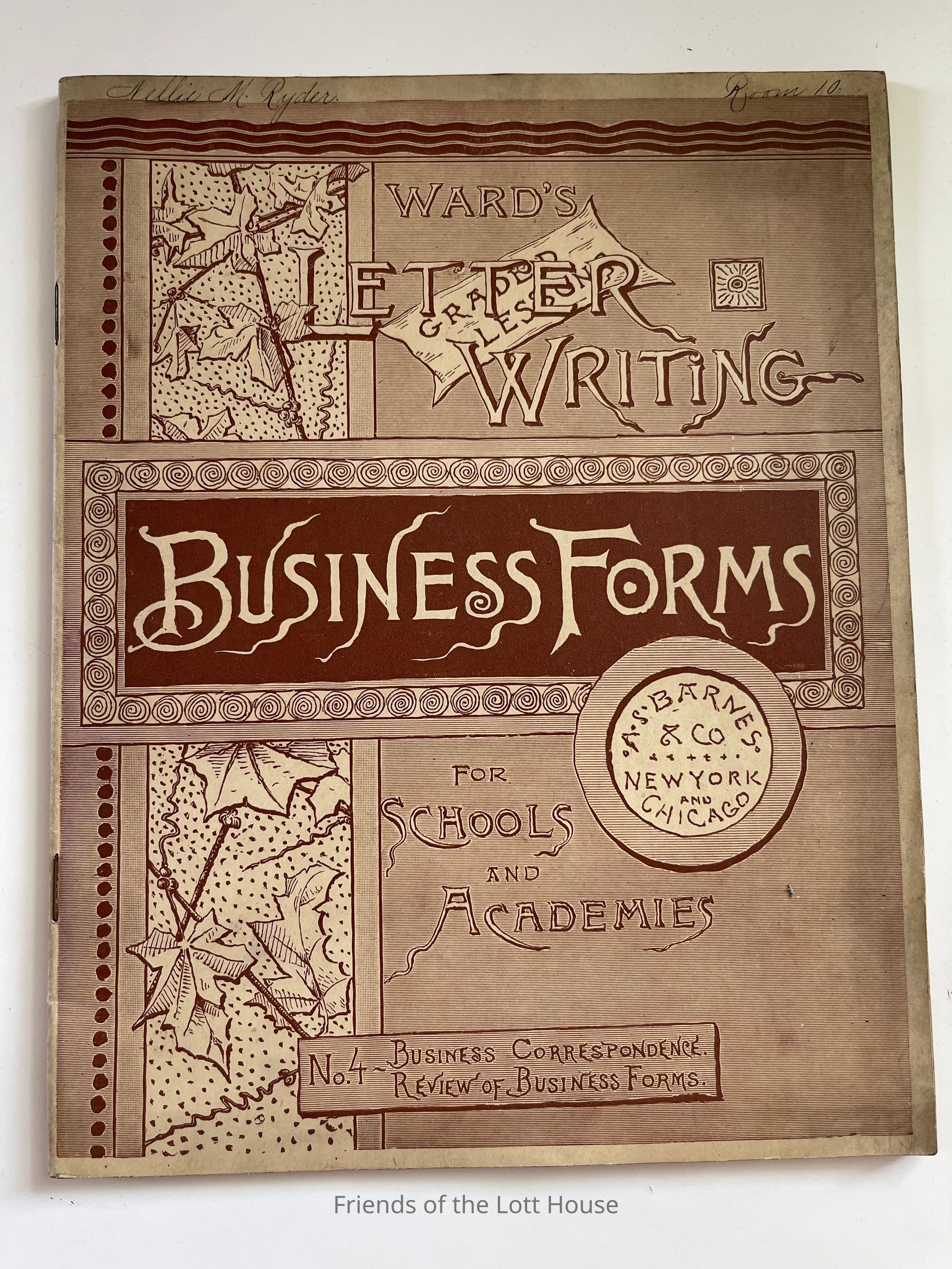 Notebook with elaborate design for "Business Forms" on it. Has Nellie Ryder's name on topCollection