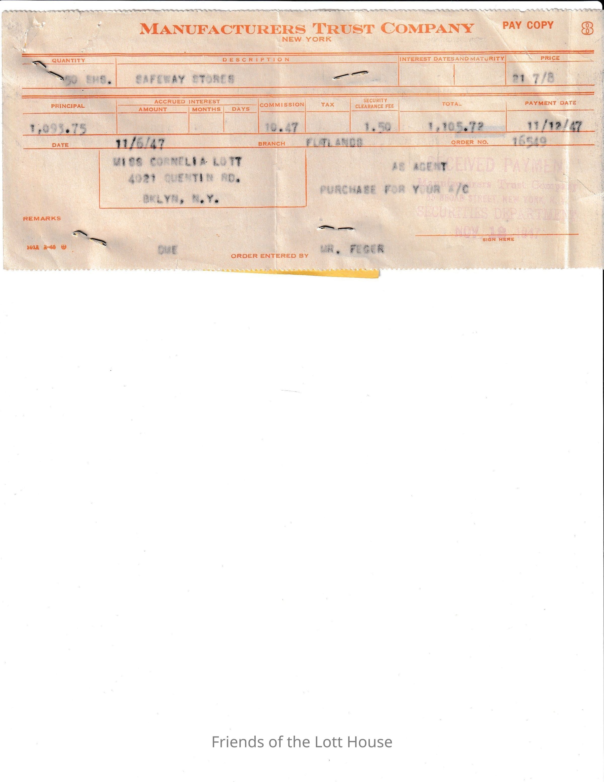 Receipt for shares purchased by Cornelia Lott from Manufacturers Trust Company for Safeway Stores on 11/12/1947Collection