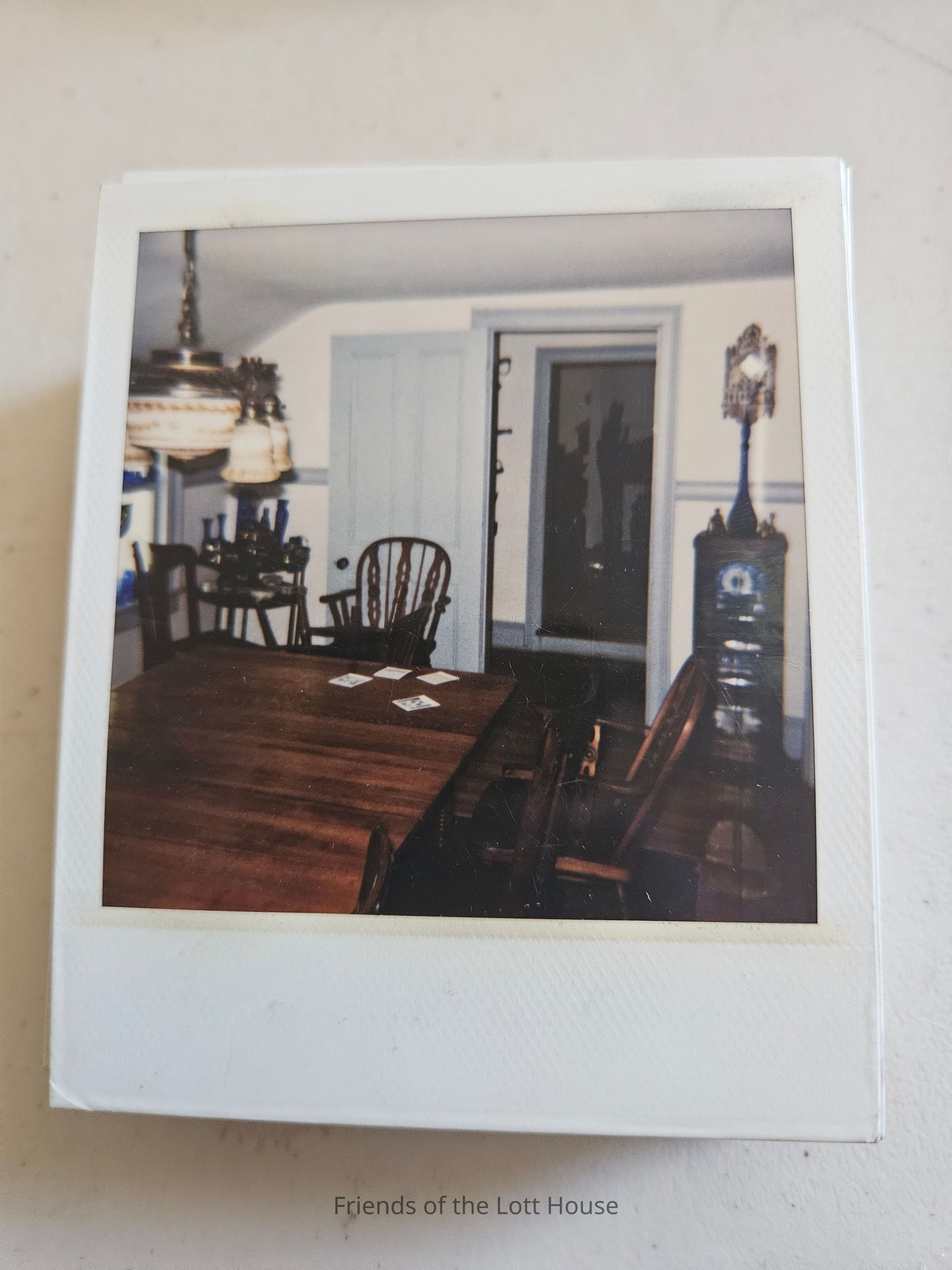 Photograph of a room decorated with a light fixture, table, chair, clock, etc. Open door in frameCollection