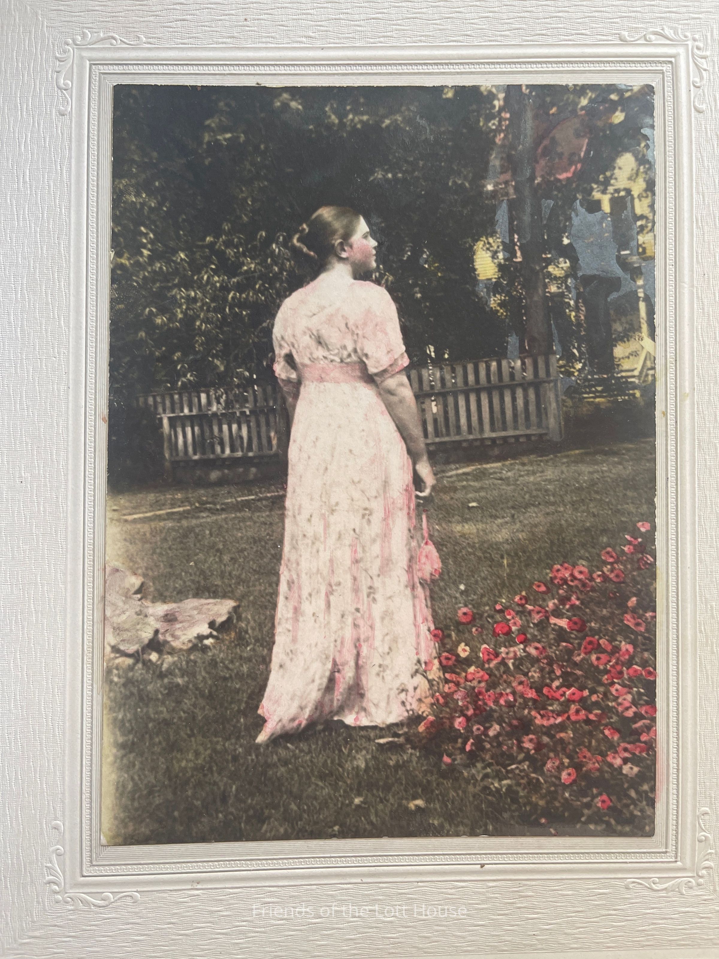 Framed photograph of a woman standing in a garden. Colored in. "Margaret D Harrison Aug 1918"Collection