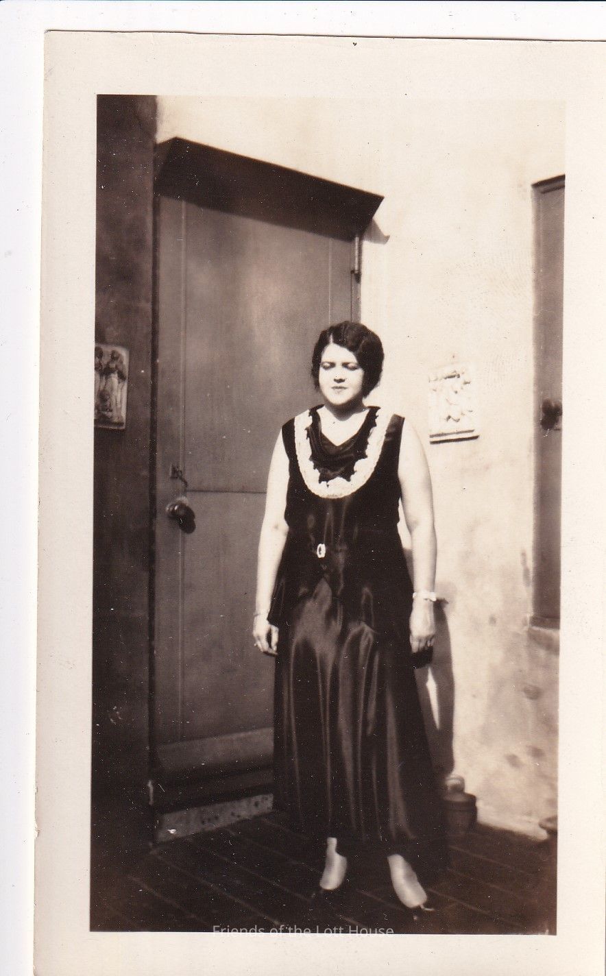 Photograph of a woman standing in front of a door. Margaret D. HarrisonCollection